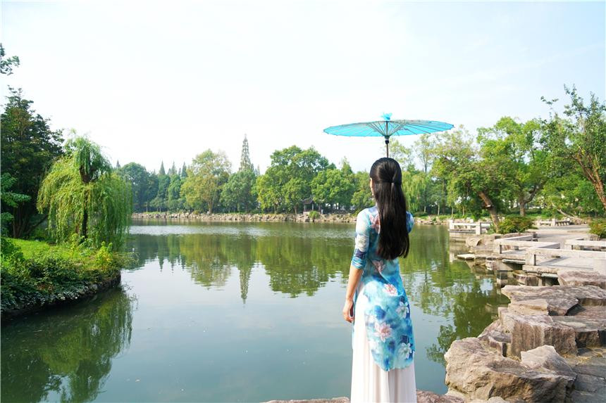 山明水净,微风轻轻,撑着油纸伞的江南女子,静静的站在东湖畔远眺,婉约成一道亮丽的风景。