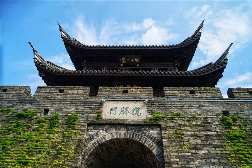 爬上数个台阶之后,我们就来到揽胜门,丽日蓝天下的城门看起来十分雄伟,长满青苔的古旧城墙上,无言的诉说着沧桑的过往。