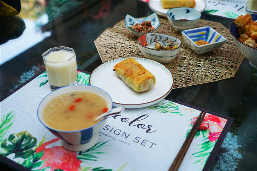 清晨睡到自然醒,云朵姐姐已经贴心准备好了早餐,坐在繁华盛放的小院子里,闻着草木的清香,一碗清粥、一杯豆浆,几样小菜,绿色健康,吃起来十分舒适。