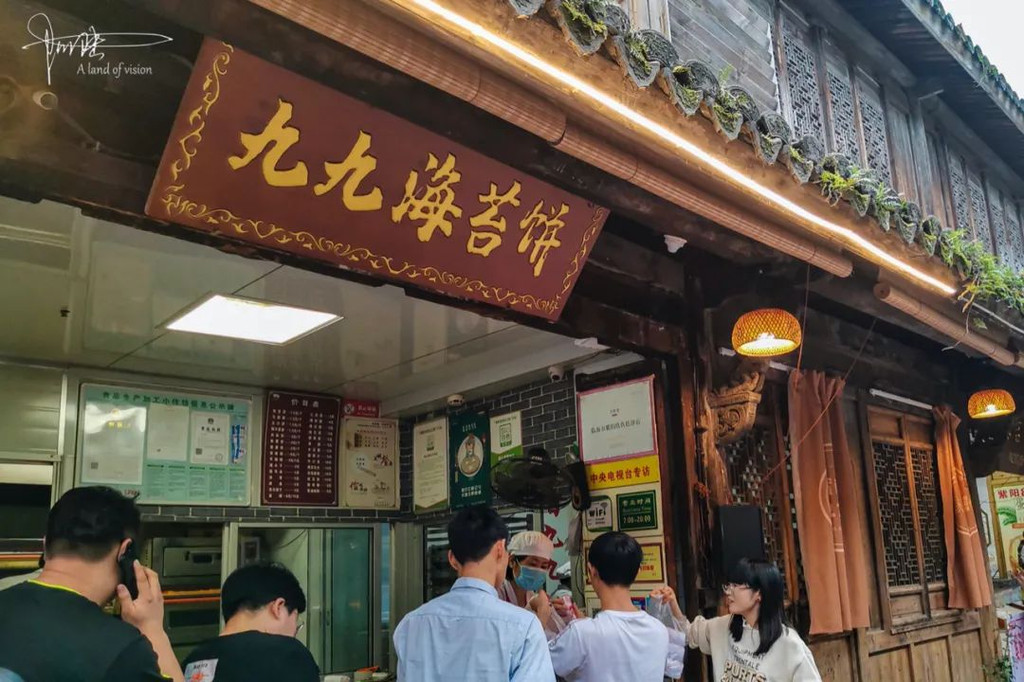 现做现卖的就有好几家,在我看来,口味应该差不多,但奇怪的是,只有这“九九海苔饼”的生意最好,据说天天门庭若市。但其实古街上还有一家“王天顺”才是真正的百年“老字号”,至今已经120多年的历史了。但为什么现在的生意没有那么好呢?传闻是因为有一次,央视来临海拍王天顺,店主刚好家里有事关门,于是转而采访后者,从此“九九海苔饼”变成了古街上最有代表性的门面,顾客也是络绎不绝,慕名而来。(如果事实当真如此,不知道王天顺的老板是不是悔得肠子都青了呢?)可惜我此行没做功课,就没到这家店打卡,有点遗憾。