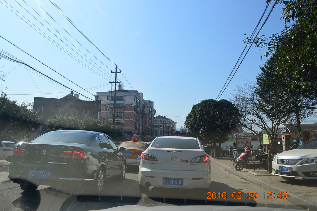 南塘老街有地下车库,但节日期间停车位紧张。大量自驾车排队等候空位进停车场,街上交通堵塞严重。
