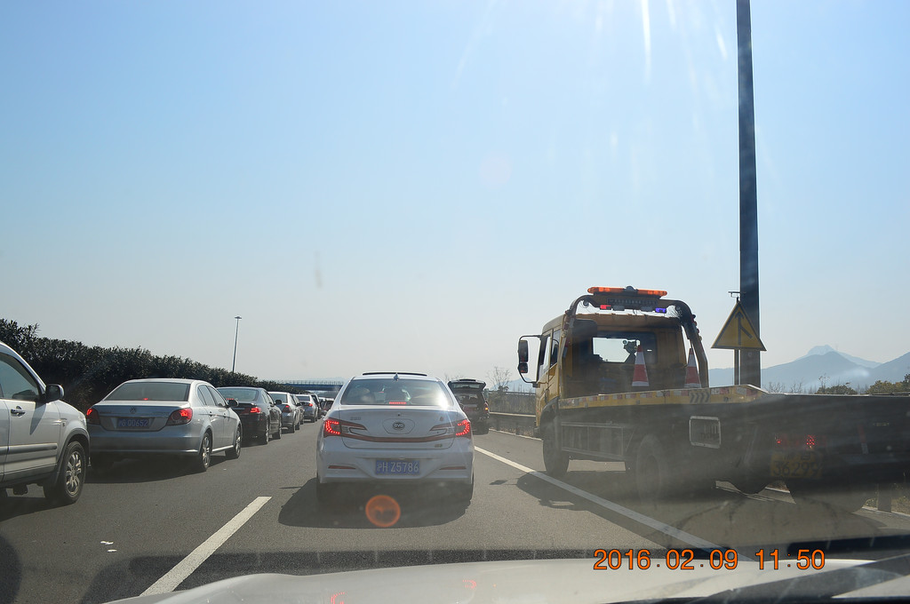 甬台温高速上第一次遇到堵车,前方有交通事故。