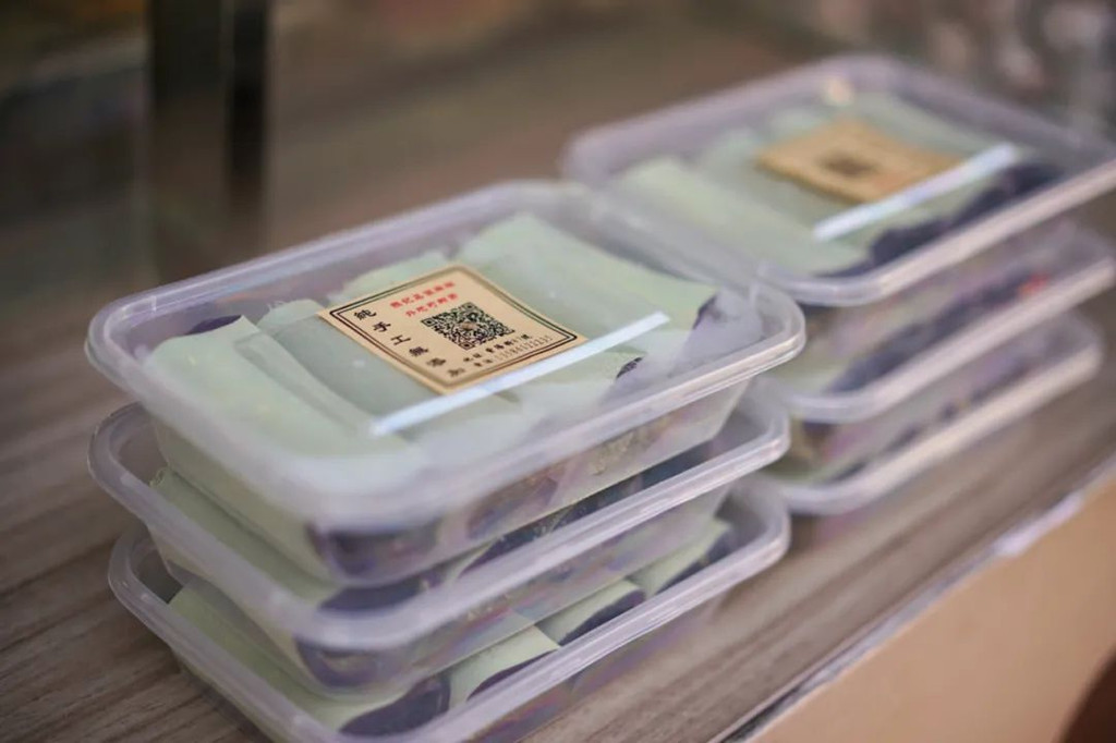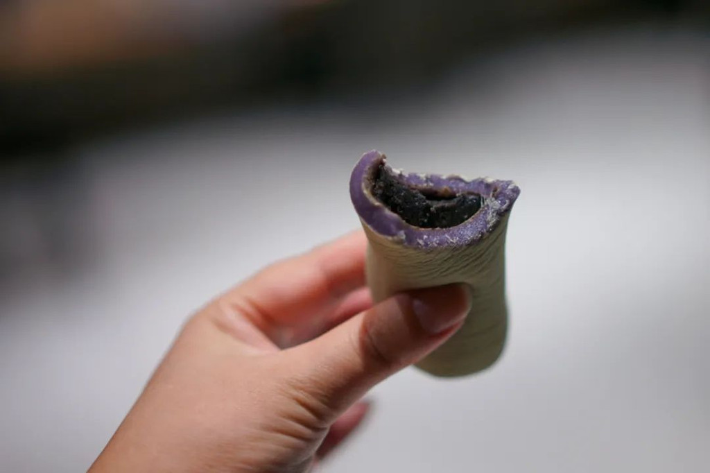 乌饭麻糍,糯唧唧爱好者不可错过的吃食。原为时令食物,现在基本一年四季可以吃到。正宗的乌饭麻糍,表面是绿色,里面是蓝紫色,这个是乌饭树汁液的颜色,吃起来软糯香甜。这个当天最好是当天吃,隔夜的话表面会变硬,口感不好。