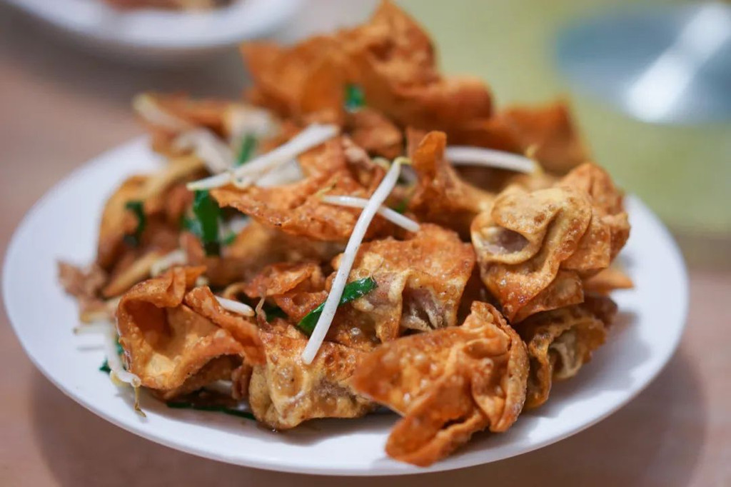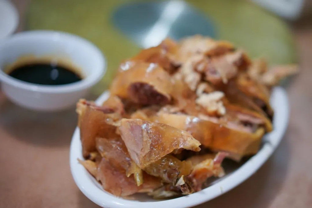 这家店据说开了七十几年,环境称不上好,但是生意不错,当地特色小吃,海鲜都有。根据推荐的点了蛋清羊尾,炒肉片,白切鸡,炸馄饨还有红烧水潺。