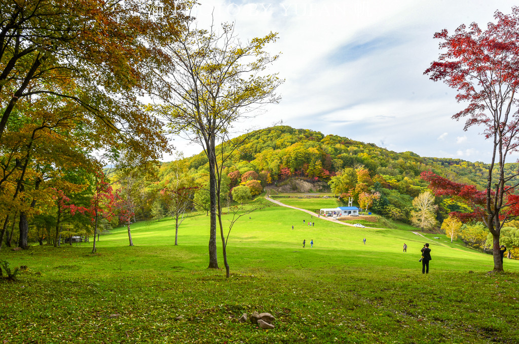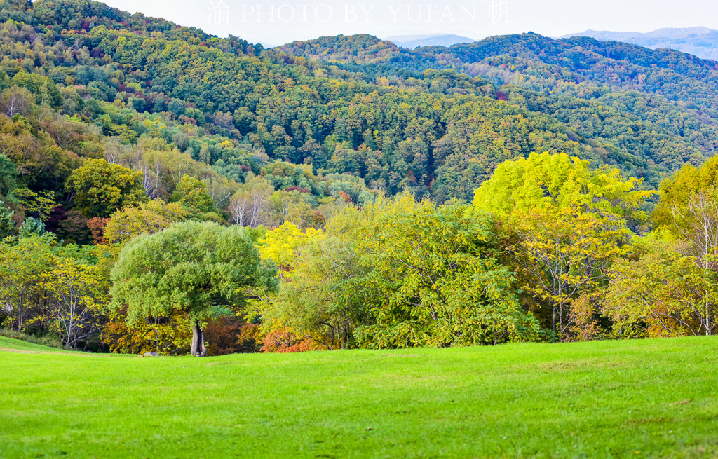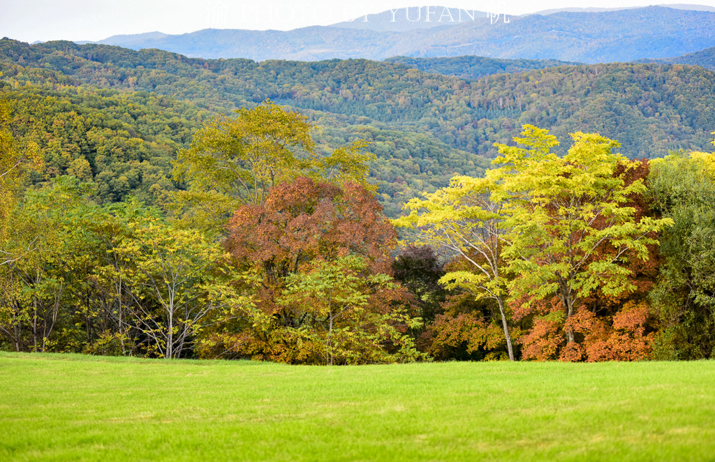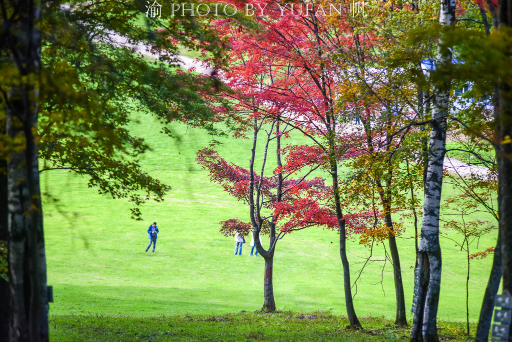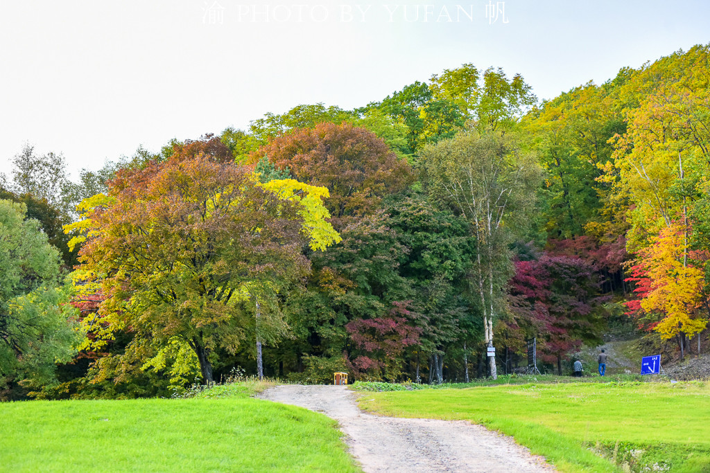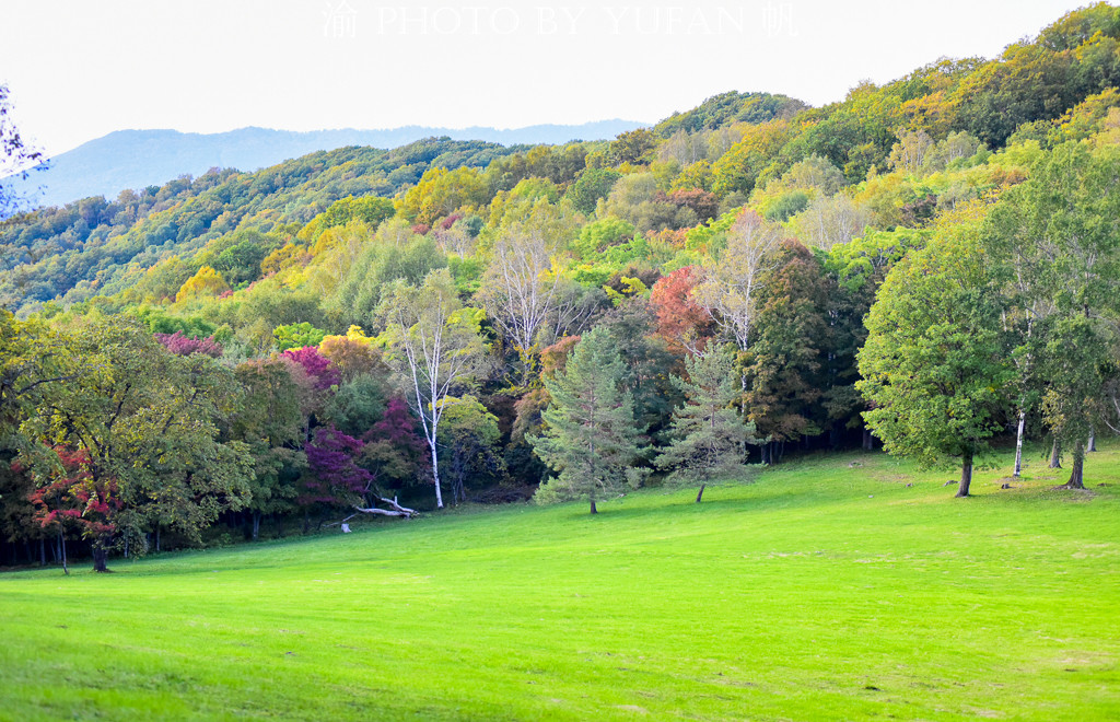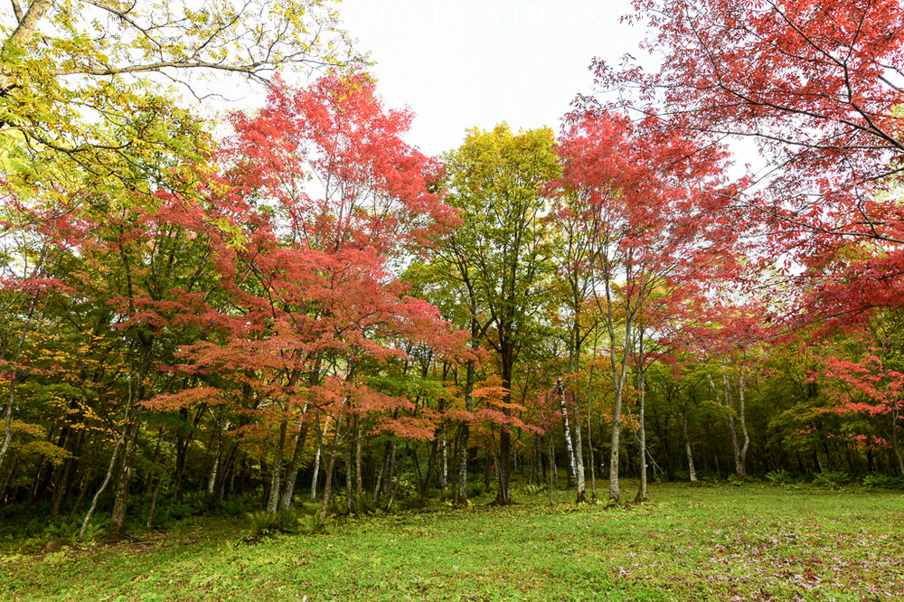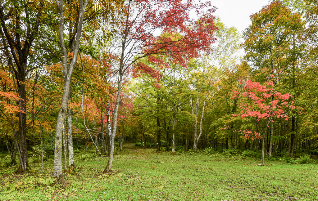 在这片草甸的四周,是茂盛的原始森林,生长着各种品种的高大乔木,虽然我们去的时候(9月23日)时间还略微有些早,但从照片上依然可以看到,有不少树木的叶片已经变色,形成色彩斑斓的五花海美景。