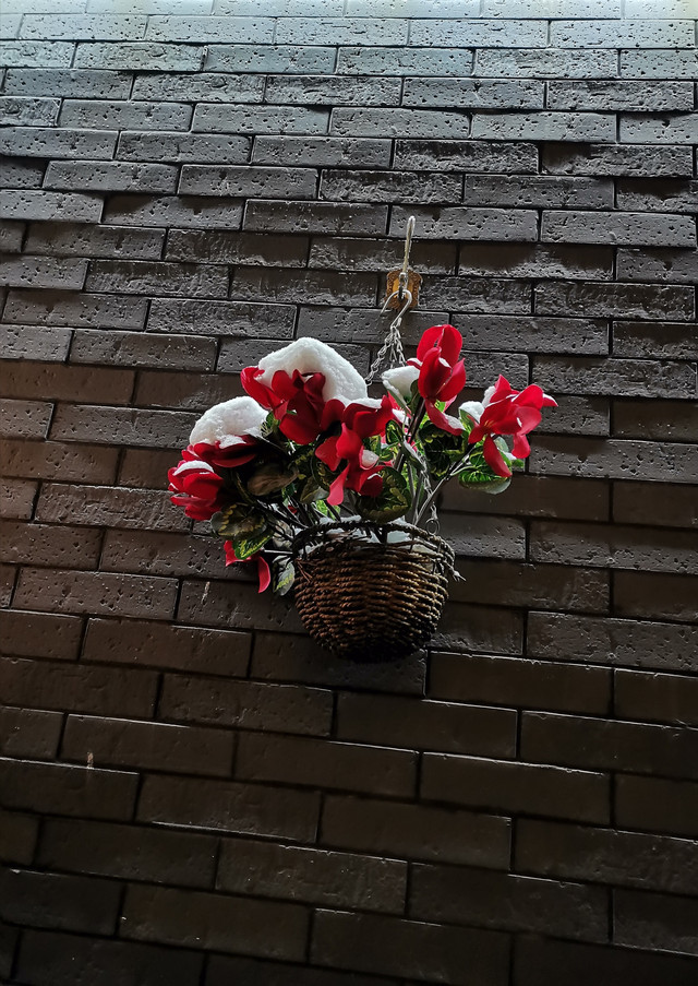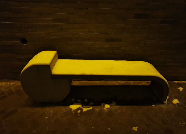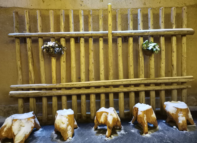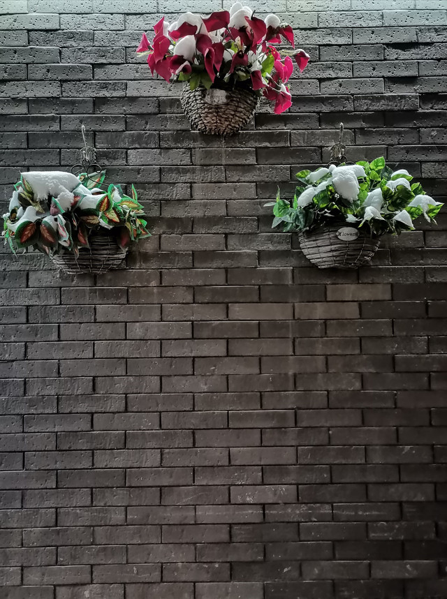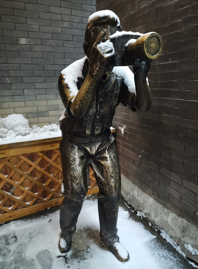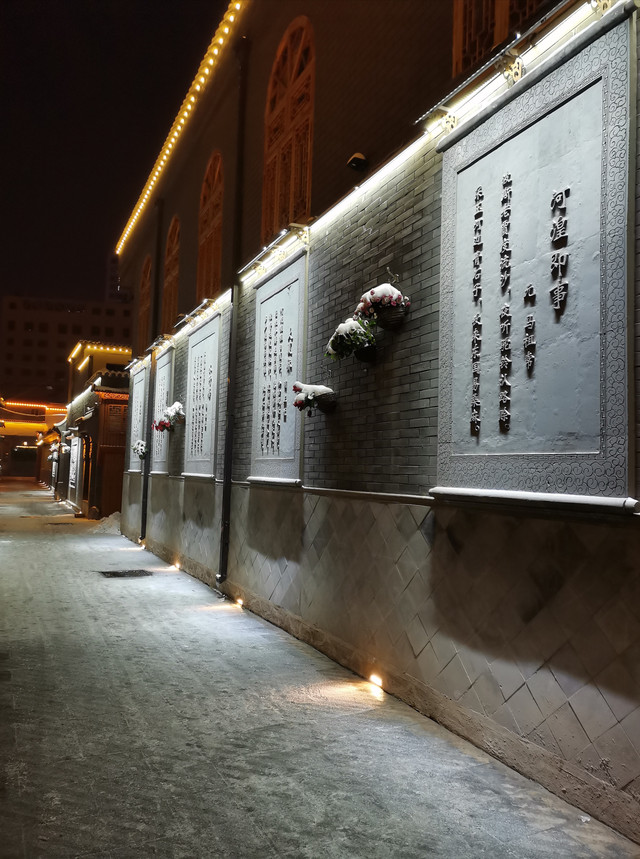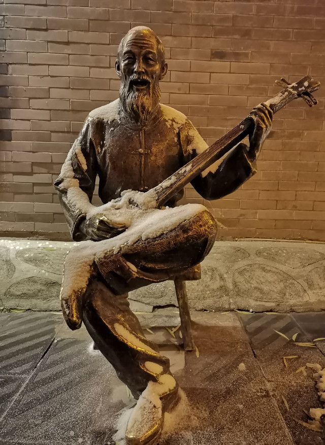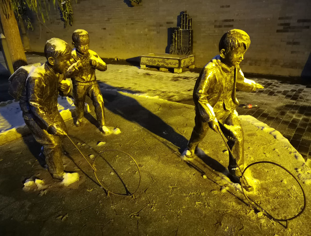 从细巷进去,红水河上映射出五彩缤纷,八坊十三巷似乎要展现出一种繁华盛世的景象。雪,反而把华灯初上的八坊十三巷点缀出另一番景色来。不论是墙上的塑料花篮,还是静静摆放在巷子里的座椅石凳,在雪色的照映下,愈发显得鲜艳和宁静。每条巷子的深处,喧嚣被幽静替代,湿润和雪光可鉴,即便是那些人文铜像,弹三弦的、照相的、买冰棍的、钉碗的、滚铁环的,看起来也是有些瑟瑟发抖的光景,光影与积雪交相辉映,衬托出一片赤橙黄绿青蓝紫。