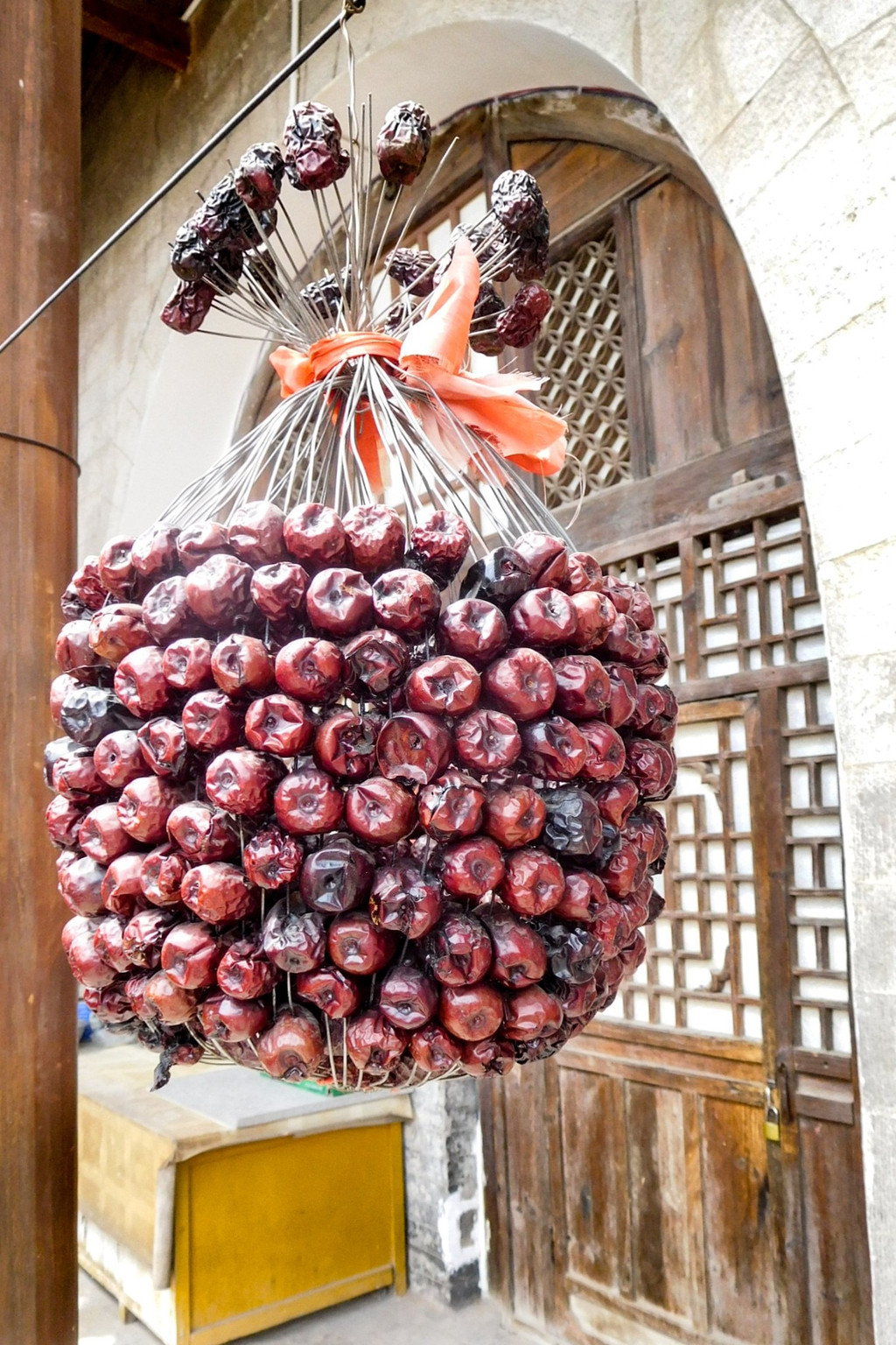 西湾村山西 盛产枣,这家的枣不知为何被铁丝串在一起成球形,是为了方便晾晒吗