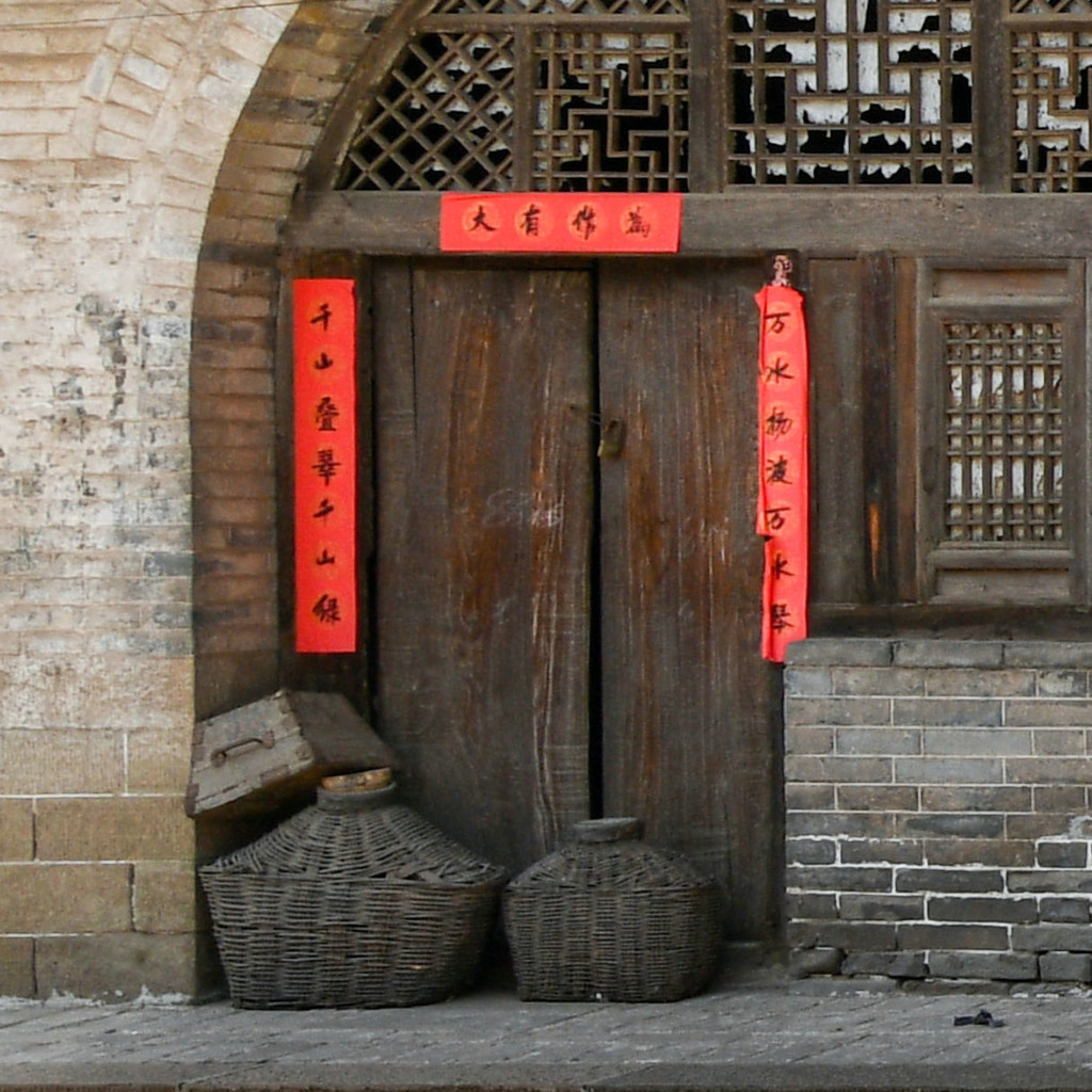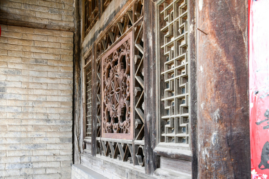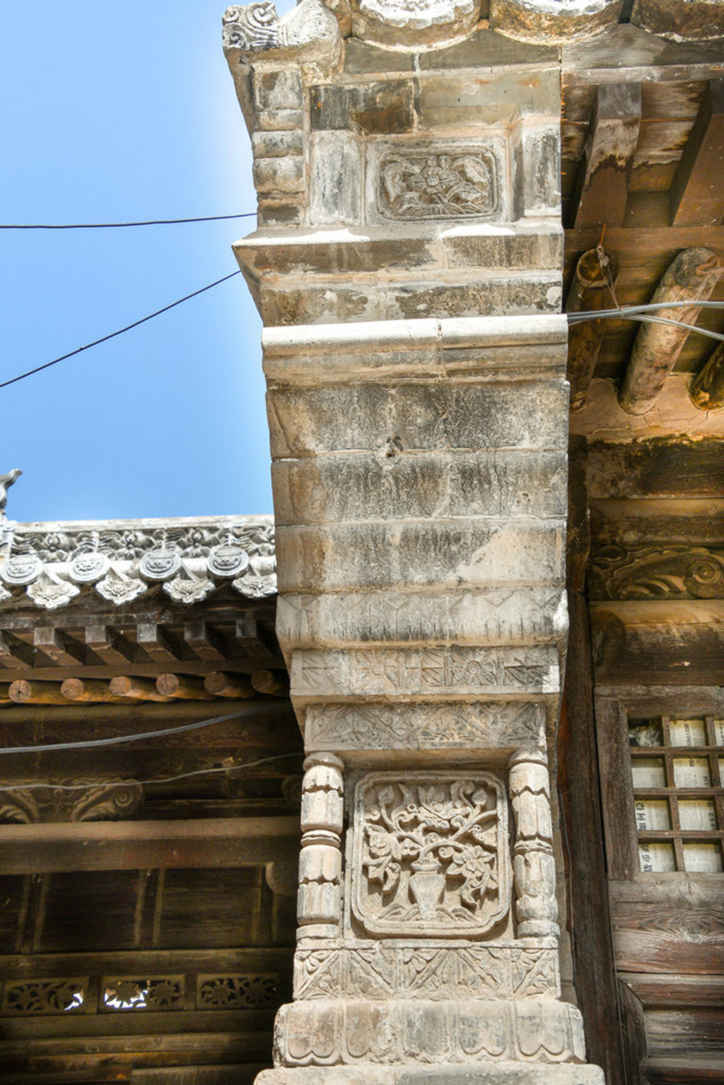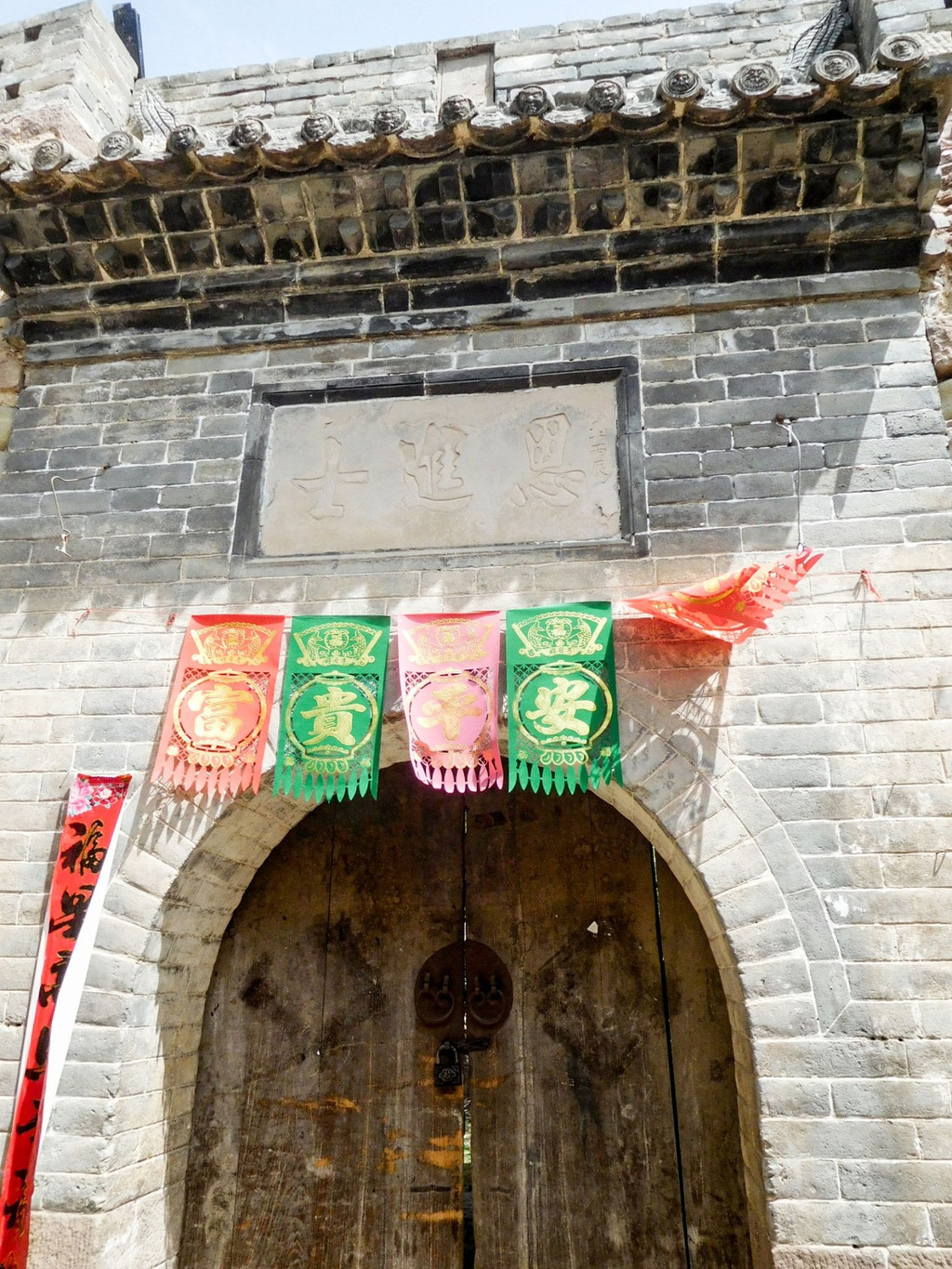 西湾村从东边的“木巷”进入村子,竹苞松茂院”,门口的老爷子招呼我们进院参观。进院要每人收2元卫生费,微信支付宝都行,大门上有吴敬命题写的隶书匾额“竹苞松茂”,竹苞松茂出于《诗经·小雅》:“如竹苞矣,如松茂矣!”意指根基稳固、枝叶繁茂、子孙兴旺发达。吴敬命是本县清末进士,北五省著名书法家。大门墙上“财神进宝”、“麒麟送子”的木刻砖雕艺术非常的精美,充分说明当时主人的社会地位和文化层次。