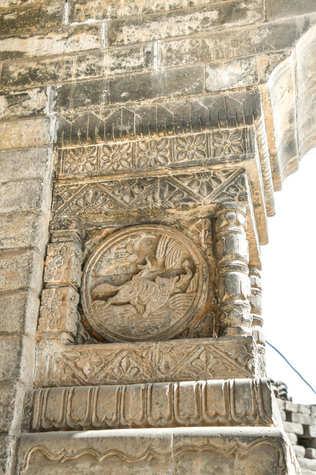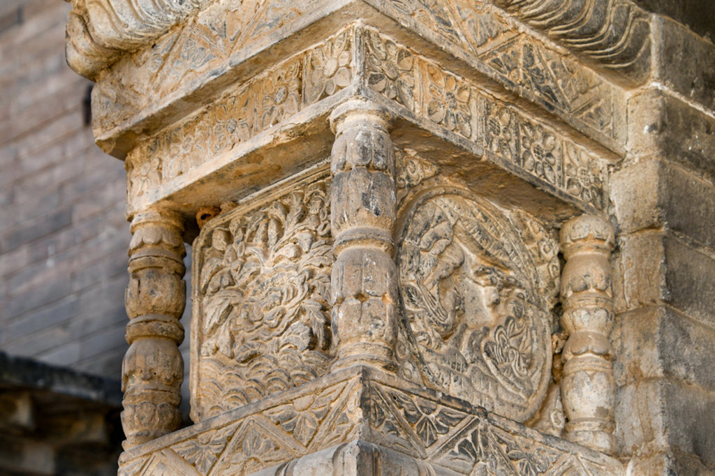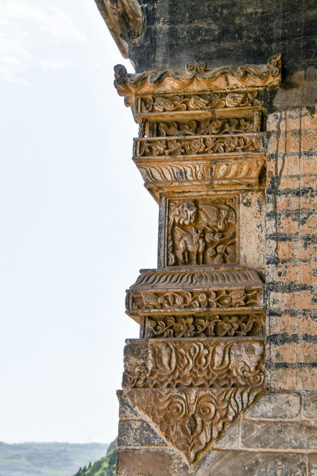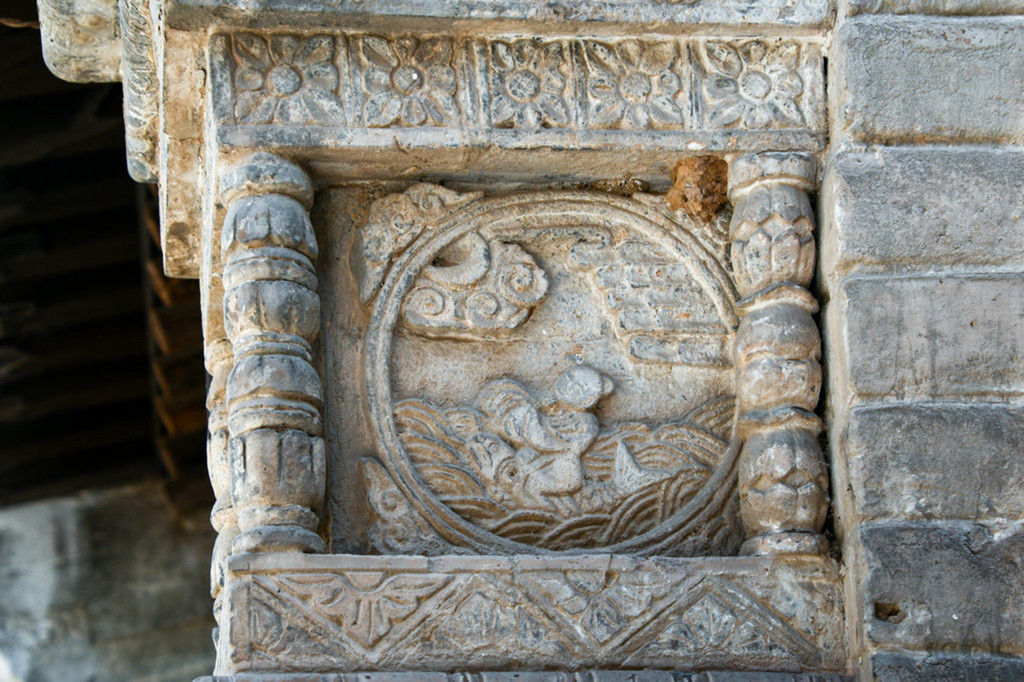 西湾村山西 地区古民居墀头雕刻常见的图案有祥禽瑞兽、吉花瑞草、吉祥文字、刀马人物等,如砖雕“喜鹊登梅”