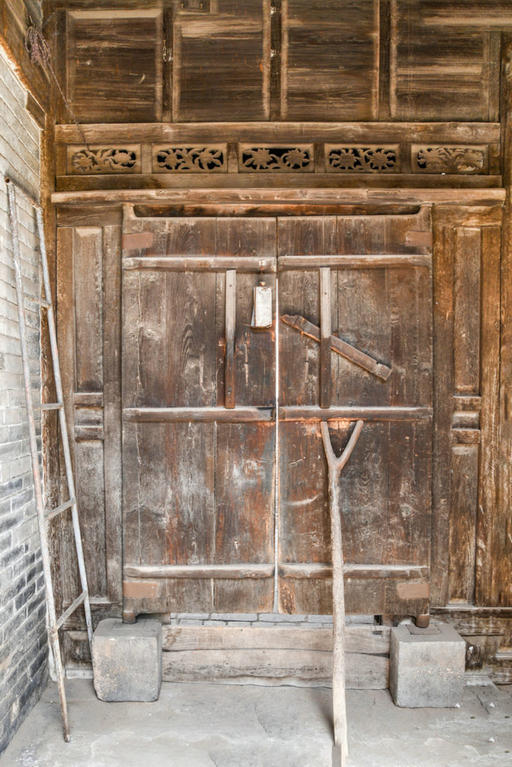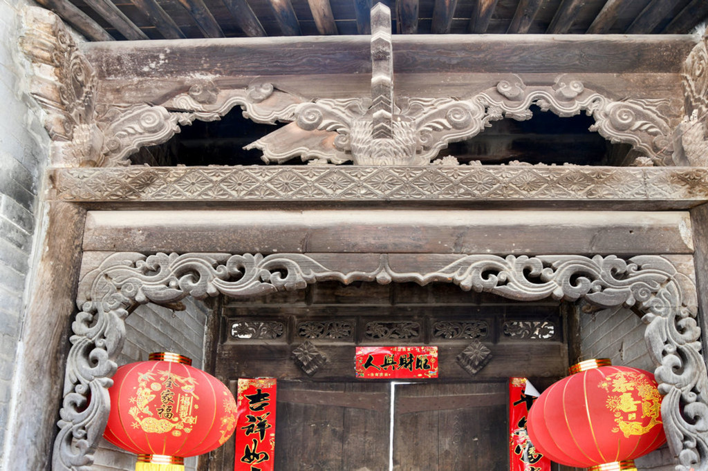 二道门的门楼是屋宇式门楼,前檐下有通栏雀替木雕卷草纹图案,檐下有三朵雕花斗拱,阑额上满雕菱形花纹,整体颜色都比较乌黑,有种历经沧桑的感觉。大门也比较特殊,两旁带有抱框,正中才是常见的对开板门。门框上有一对雕花门簪。阑额板上同样雕满花纹
