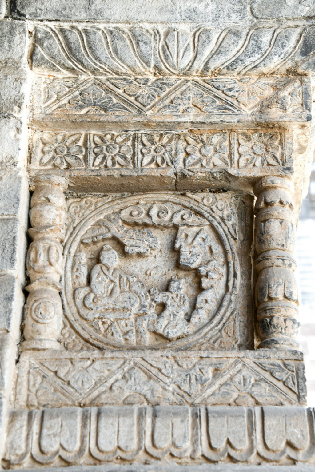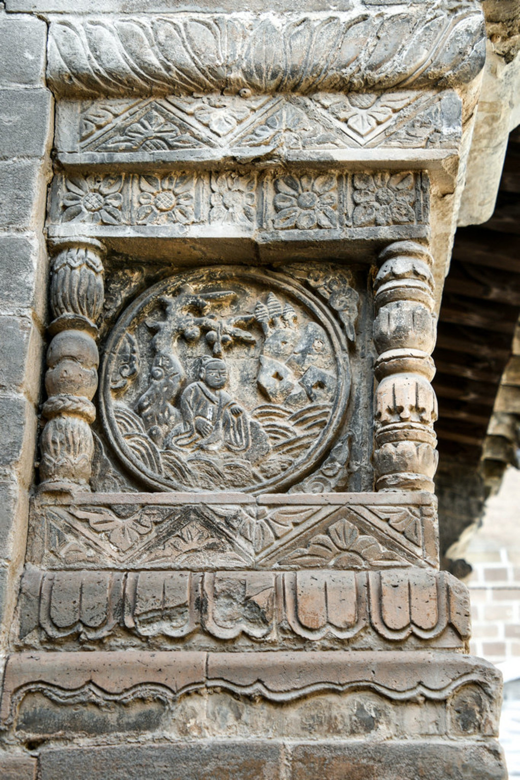 西湾村骑鲸捉月背后这幅砖雕是孟母教子。孟母教子的故事大家耳熟能详,孟母施教的种种作法,对于孟子成长为思想家影响极大。这样的故事雕刻在最显眼的部位,也能体现晋商发家致富之后的一种崇商敬儒的心理