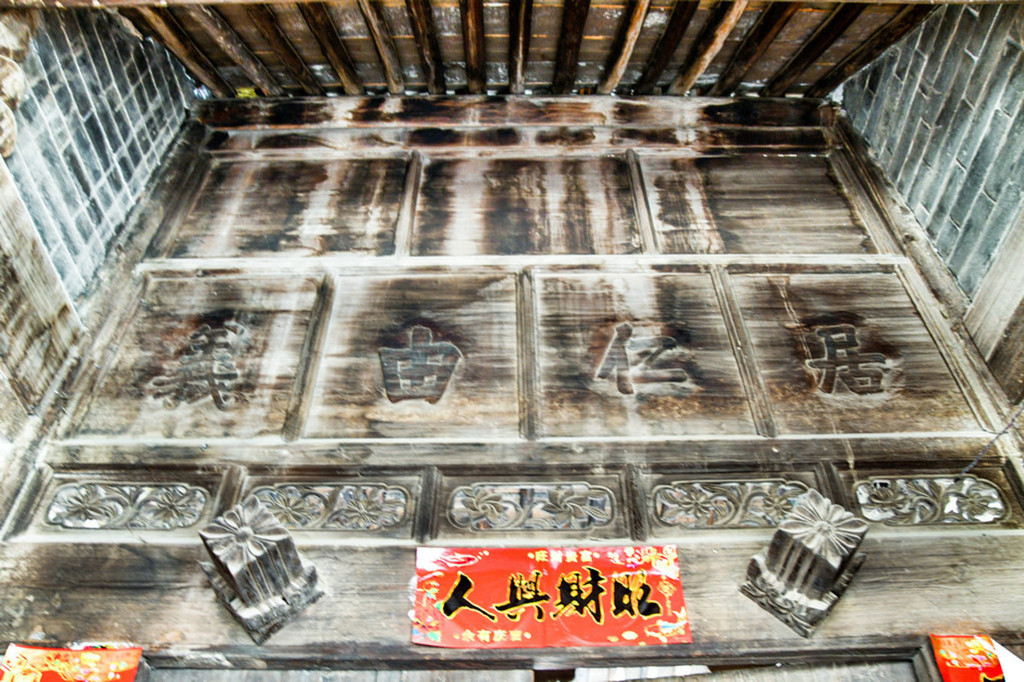 木雕门匾“居仁由义”。这四个字出自《孟子·尽心上》,意思是居心行事、一切都遵循仁义。四个大字是房屋主人的传世家训,由此可见陈家经商之理念。。