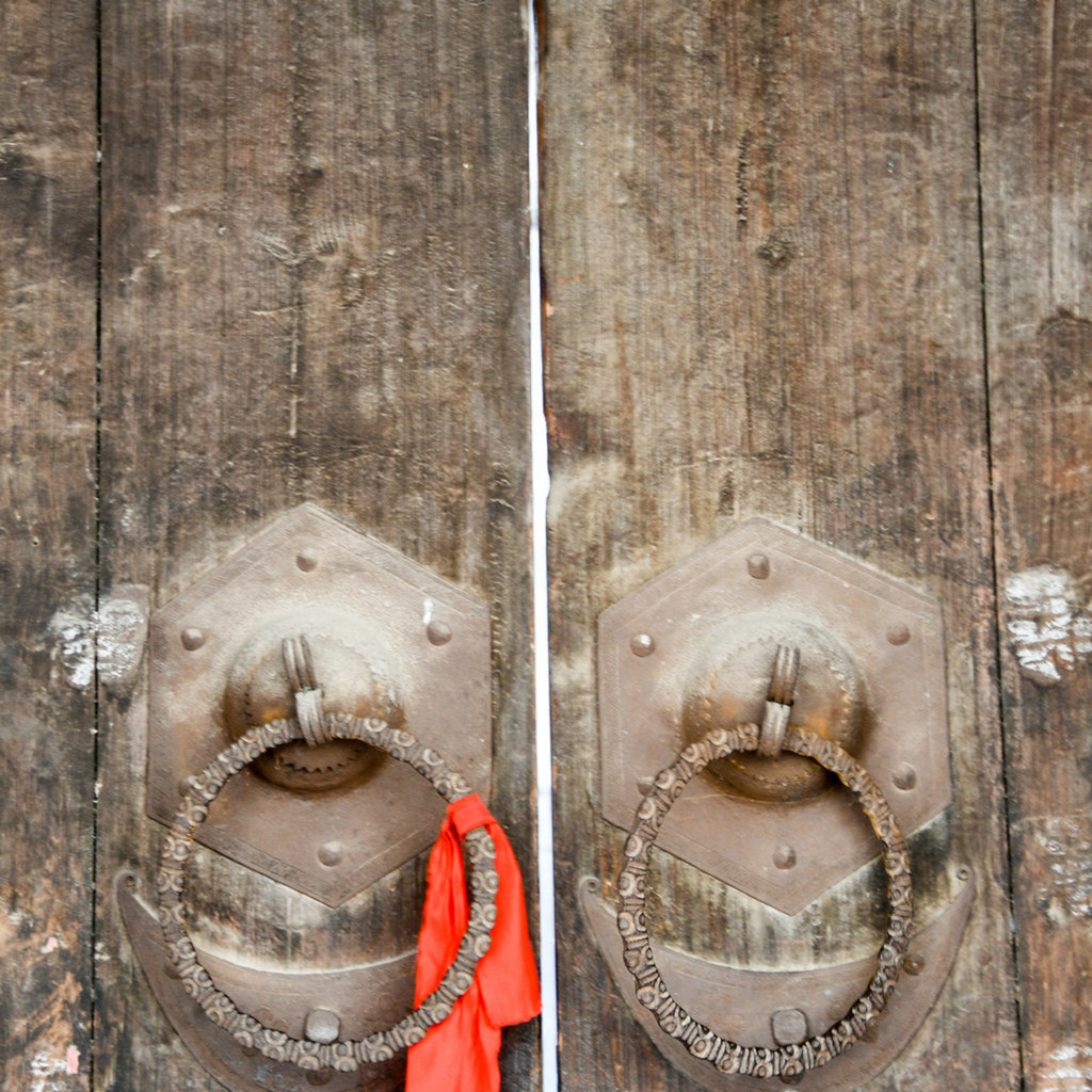 西湾村在大门板上,一对六角形铁门钹上,镶嵌着环纹精美的铁门环,比常见的绞丝纹饰要精致很多。门钹下面还钉着一块元宝形的护铁,防止门环磕坏木质板