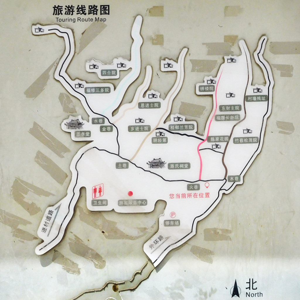 西湾游览图:整个村落由五条南北走向的竖巷分隔开来。这是一个单姓村,村里的几十户人家几乎都姓陈。他们的迁居始祖是西湾村的创建者陈师范。西湾村整体设计奇特,整个村落由五条南北走向的竖巷分隔开来。这五条竖巷寓意为金、木、水、火、土五行,代表着陈氏家族的五个支系。各个支系的人分别依这五条巷子聚居,既便于管理,又易于日后村落向左右扩展。