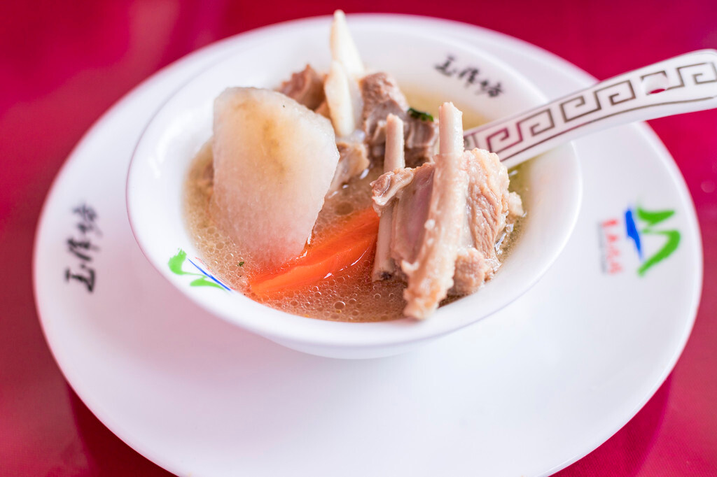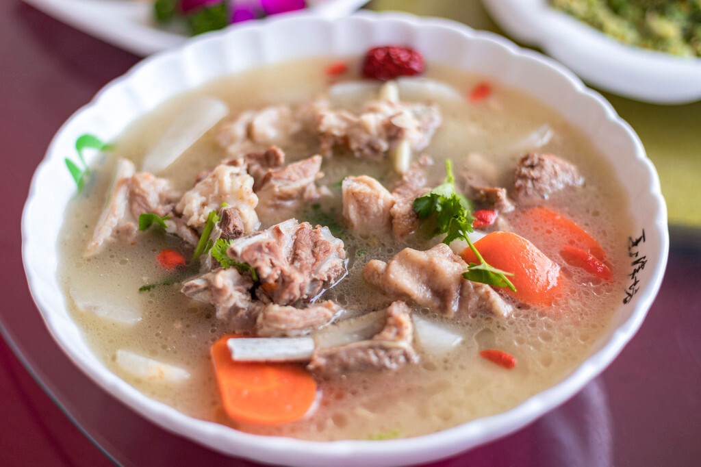 蒙山全羊汤选用的食材是沂蒙山区散养的山羊,羊膘肉嫩,不膻无腥。用地道庄户烀法,将羊的肉、骨头、羊头蹄、肚肠,洗干净放入大锅中,再加入纯天然山泉水,用木柴大锅熬炖。