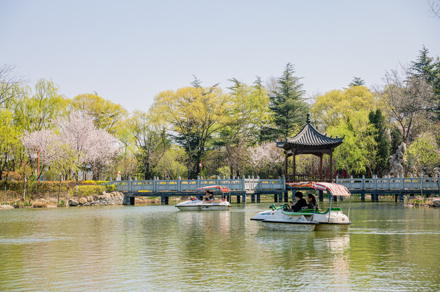 东线在假山东侧沿着游泳中心的方向朝东走,这条线会经过很多,首先是阳光草坪,游乐园。草坪适合踏青野餐,游乐园就是孩子天下,碰碰车、小火车、旋转木马等。继续走就到了最大的人工湖,插穿着湖心岛,还可以坐小游船。最后到东门,在东门的南边有个小院,不太起眼,一定要好好找。那就是聆音园,一个非常优美的明清式园中园,园内除了古色古香的景还提供书画展览交流和中医健康服务。