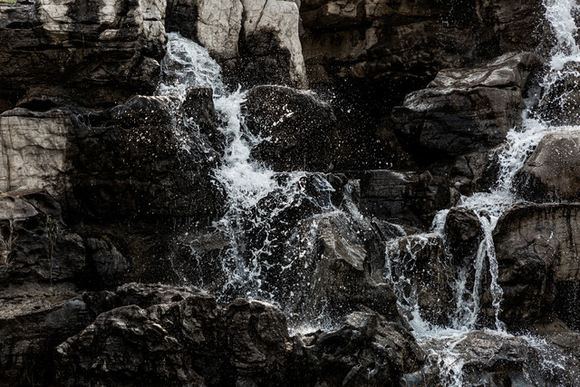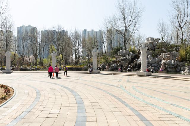 进入园区,是一条很宽的主路,走到头是一个圆形广场和假山跌水。这个区域主要是路右侧的玉斕堂、姬路城和左侧的游泳中心。中心的东面主要是办公区。