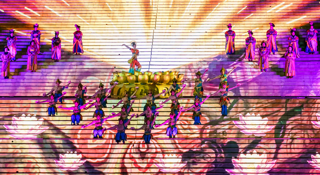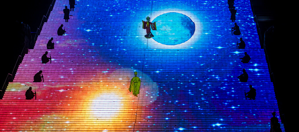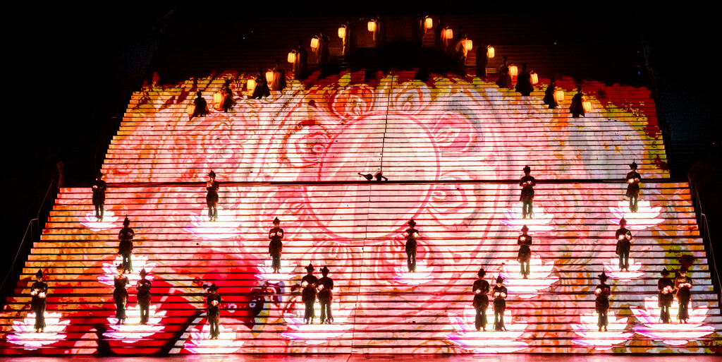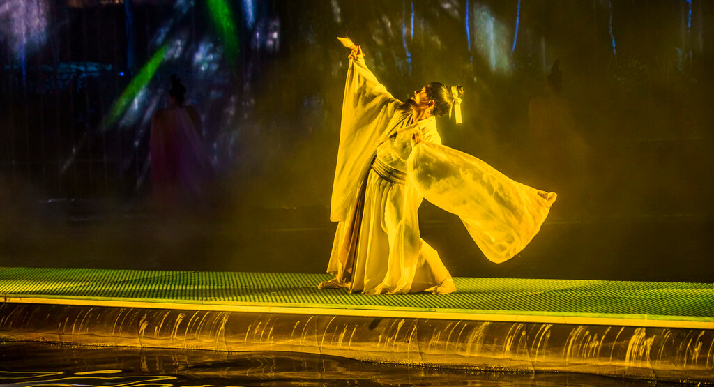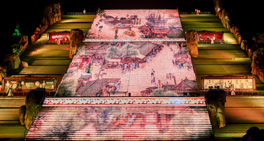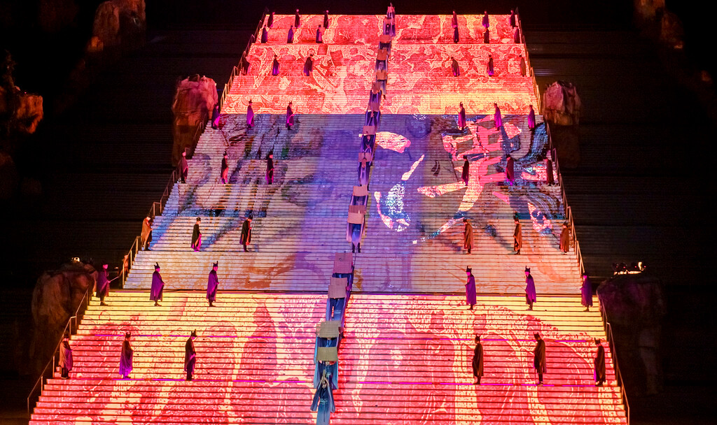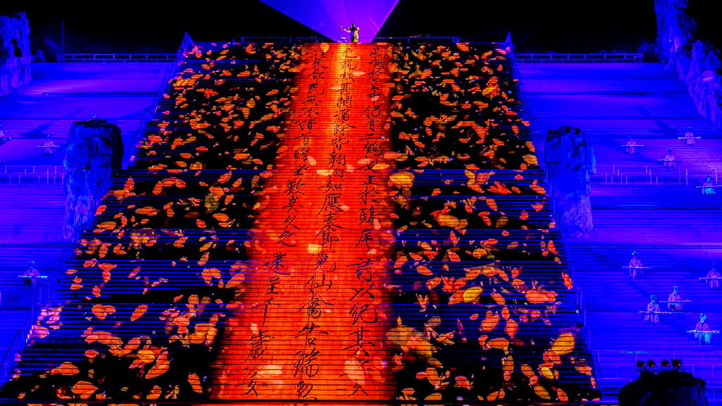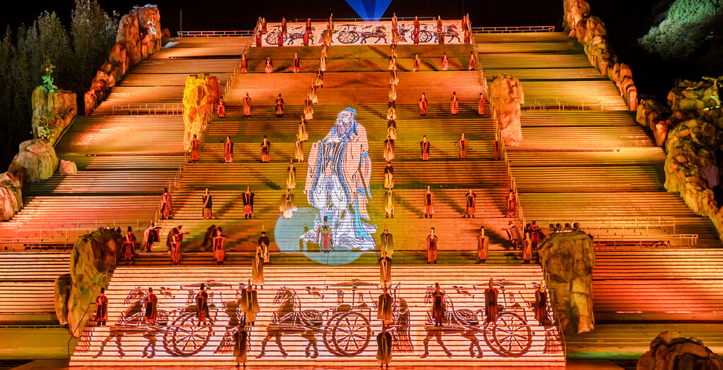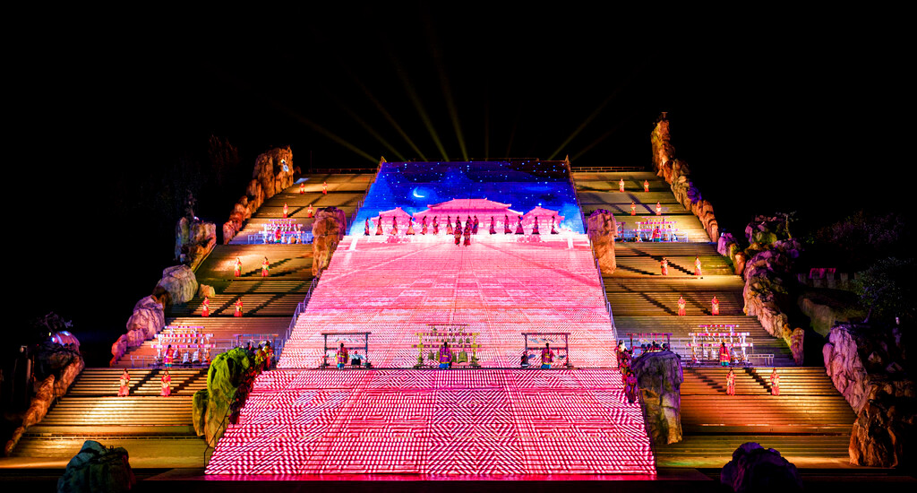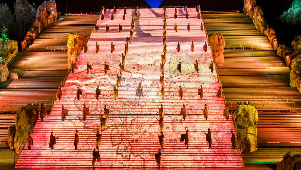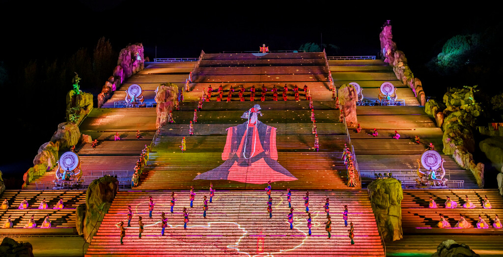 整场演出分为序幕、秦、汉、唐、宋、清和尾声七个章节,主演区依托山坡而建,就像是一个巨大的封禅台,在演出灯光的作用与周围山形林相背景的配合下,呈现出典型的泰山自然环境与历史的意境。特别是在很多高科技的加持下,呈现出来的舞台效果很震撼~