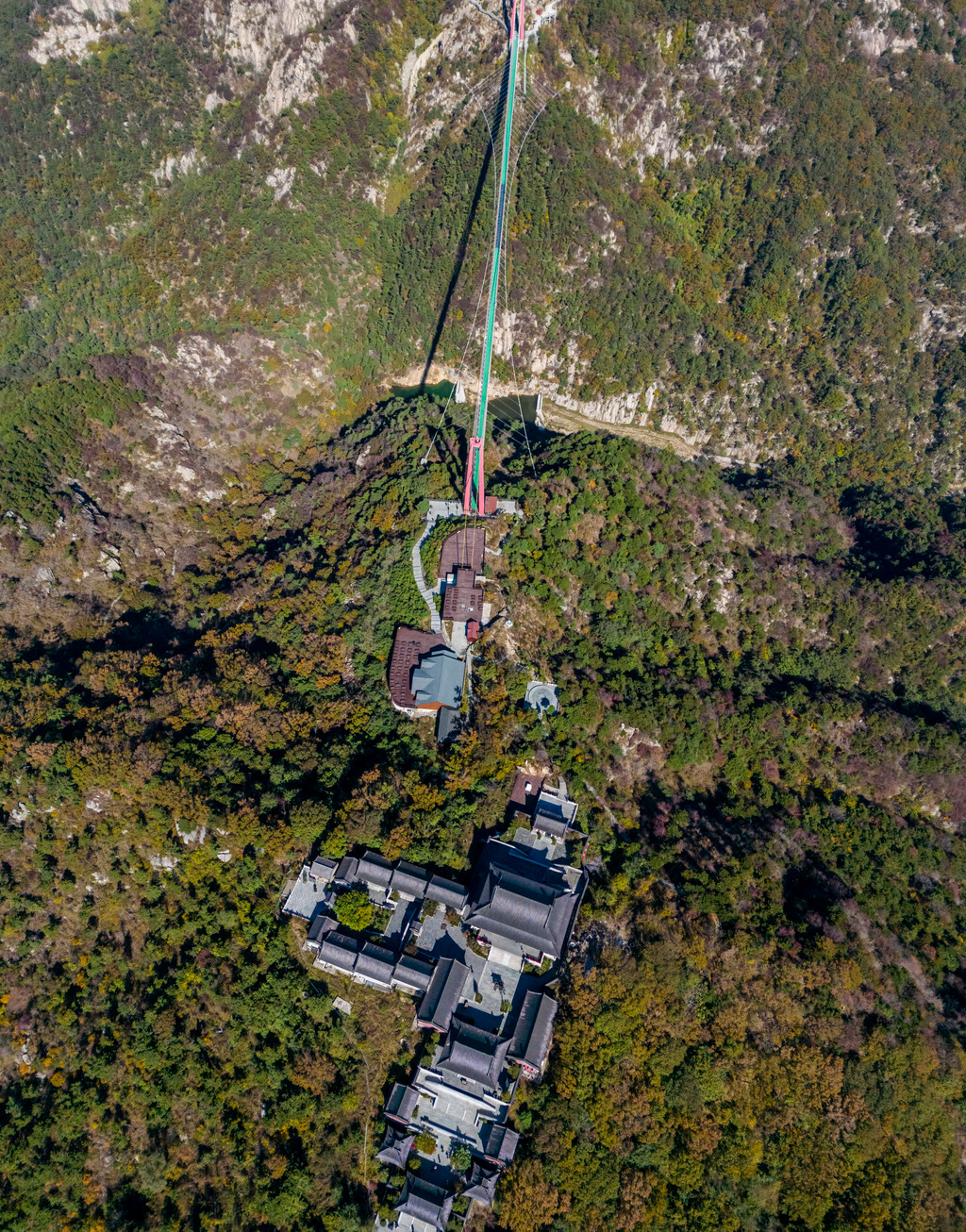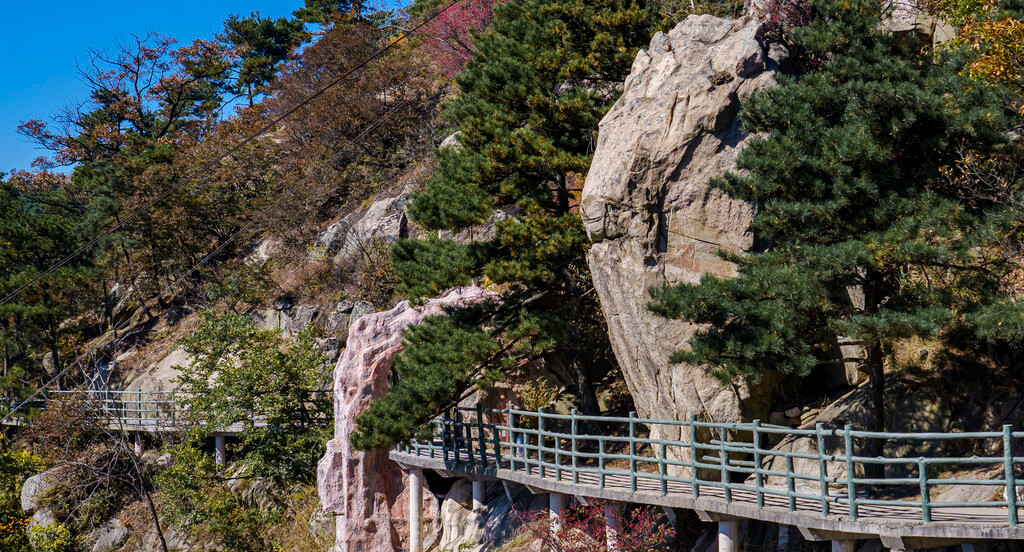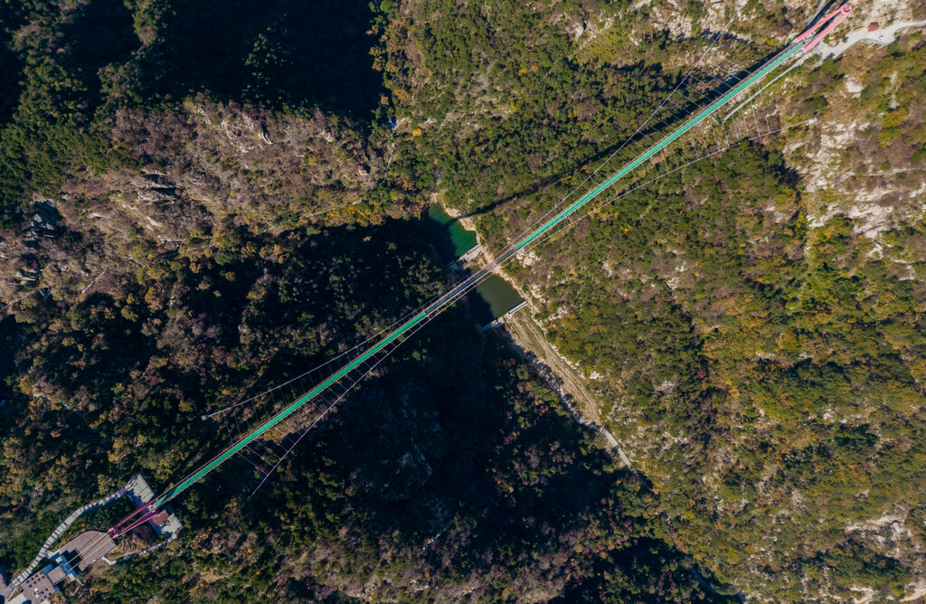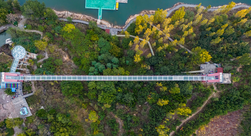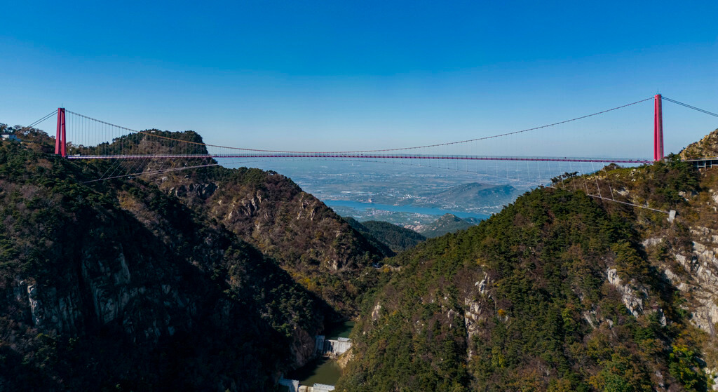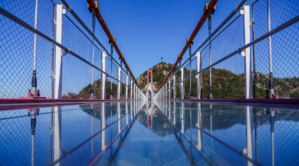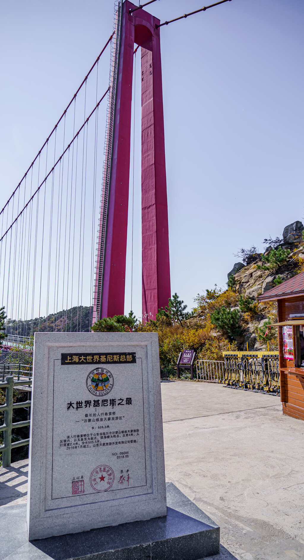 山间步道两旁有各种五颜六色的树叶展示出非常漂亮的秋景,还有可爱的松鼠、小鸟在山间跳来跳去,从望海楼一路走到对面,便来到了世界最长、跨度最大的“人行玻璃悬索桥”,桥头还展示了相关的认证证书,这条人行索桥连接了望海楼和玉皇顶两个景点,全长高达420米,也是沂蒙山的招牌景观之一。