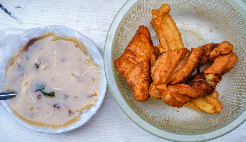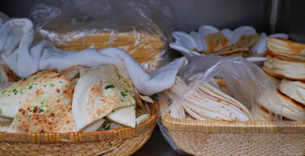 店里的葱香饼、油条、馍馍都是无限量供应,标配套餐只用8块钱就能吃到撑,当地人都用小筐装着这些东西,然后拿饼包着油条配小菜吃,烟火气十足,不过我觉得饼还是有点干,在糁里泡一泡才是极品!