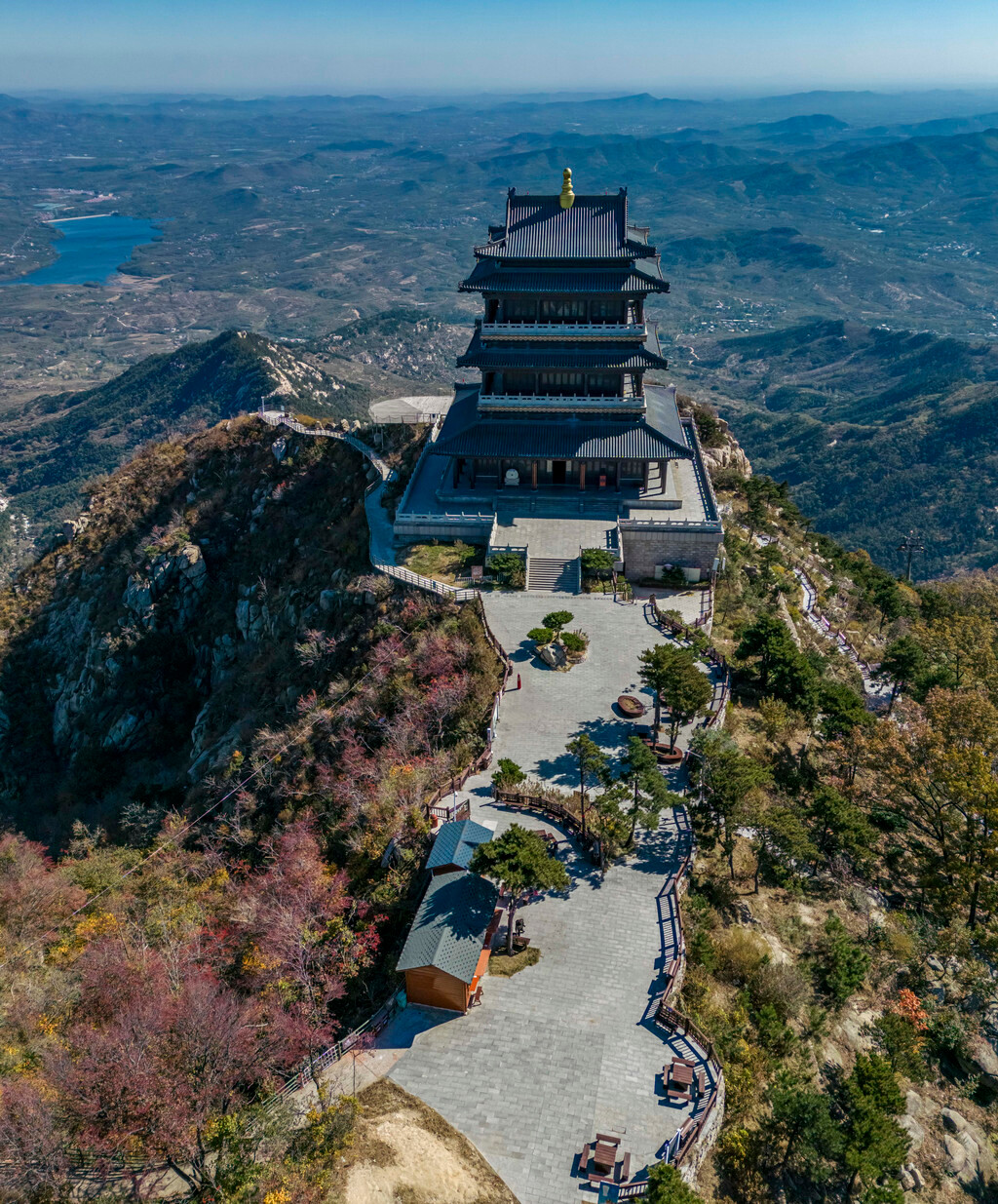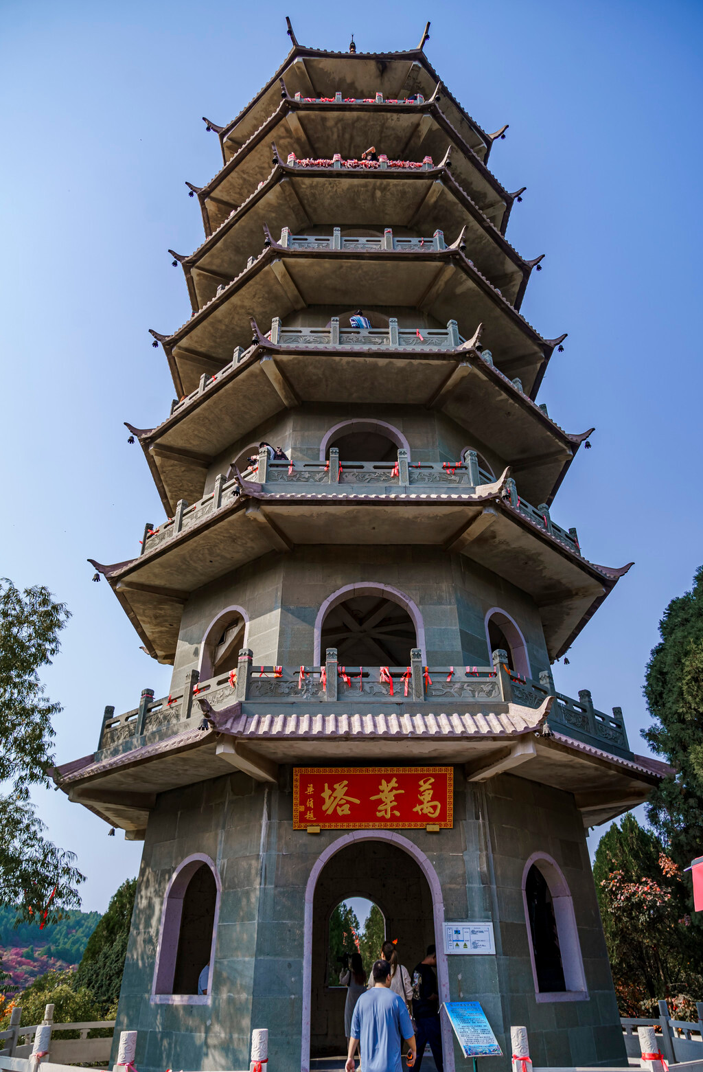 作为“最佳赏叶点”,登上万叶塔之后可以俯视整个景区全景,而且因为高度、窗户角度的变化,每一层塔身所看到的景色都不相同,具体之奥妙等你来了之后就会发现。而在万峰塔的楼上,通过拱门欣赏外面的山景、红叶,如果有人站在这个位置的话,拍出来会更好看,是一个很好的取景点~