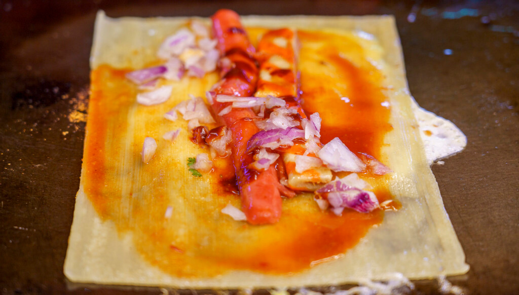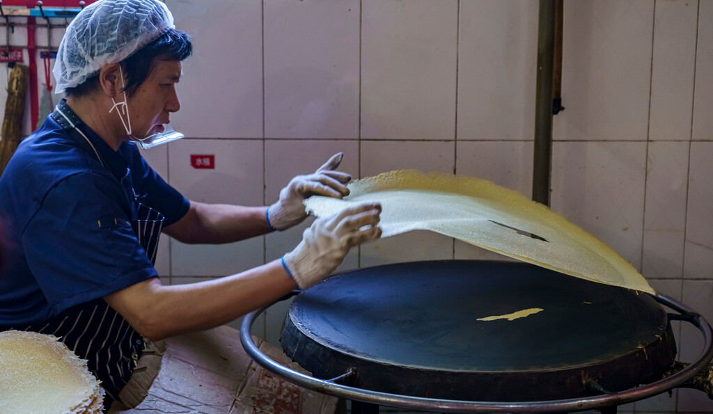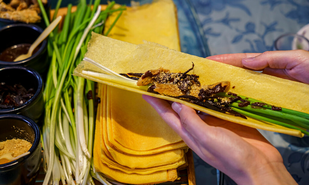 因为生意很好所以都是制作出来马上就端上桌,最大程度保证了煎饼的最佳口感,再搭上秘制的大酱,放入小葱、小黄鱼、咸菜,一口咬下去极具嚼劲,不愧是地方招牌~