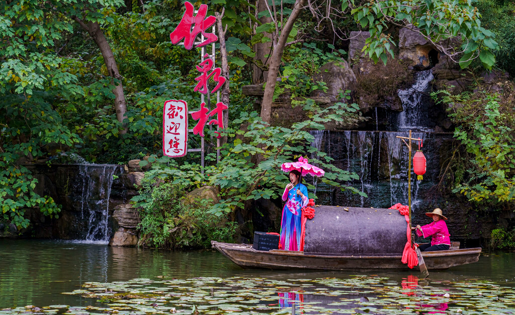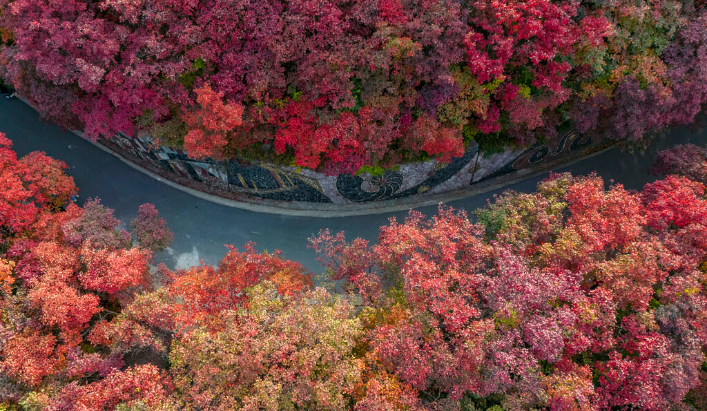 从万叶塔下来便是【揽秀亭】,左边是红叶山道,右边是翠色竹林,漫山遍野的红叶在其外围环绕,也是一处拍照打卡的绝佳点位。其实,最开始看到的便是位于谷中的【绚秋湖】,但我建议大家直接上万叶塔玩了之后再下来,这样刚好也可以休息。湖边还有租船的地方,可以选上一条好看的小船,一边游湖一边欣赏四周山上红叶,再喂喂嬉戏的鸭子,很是悠闲~