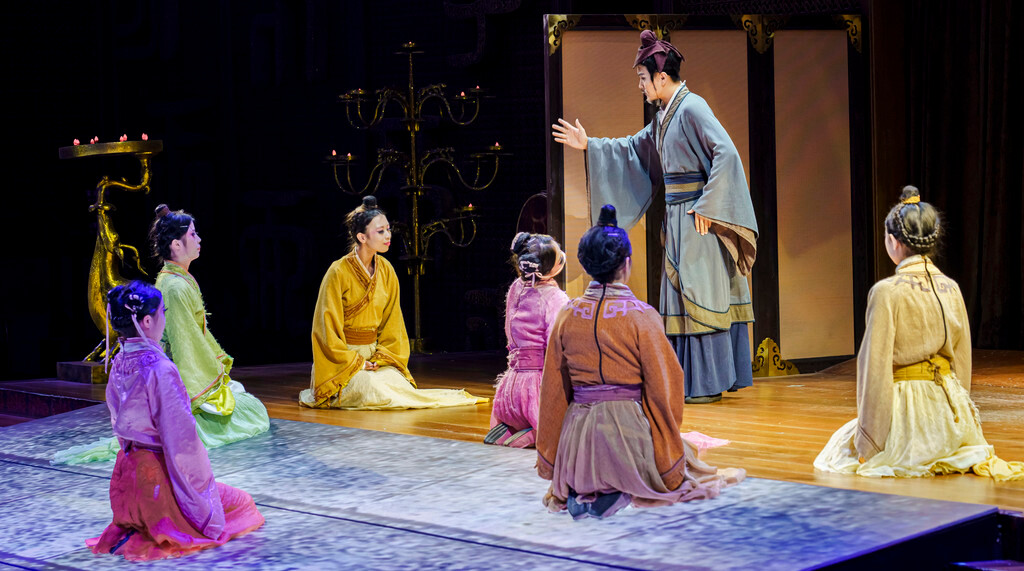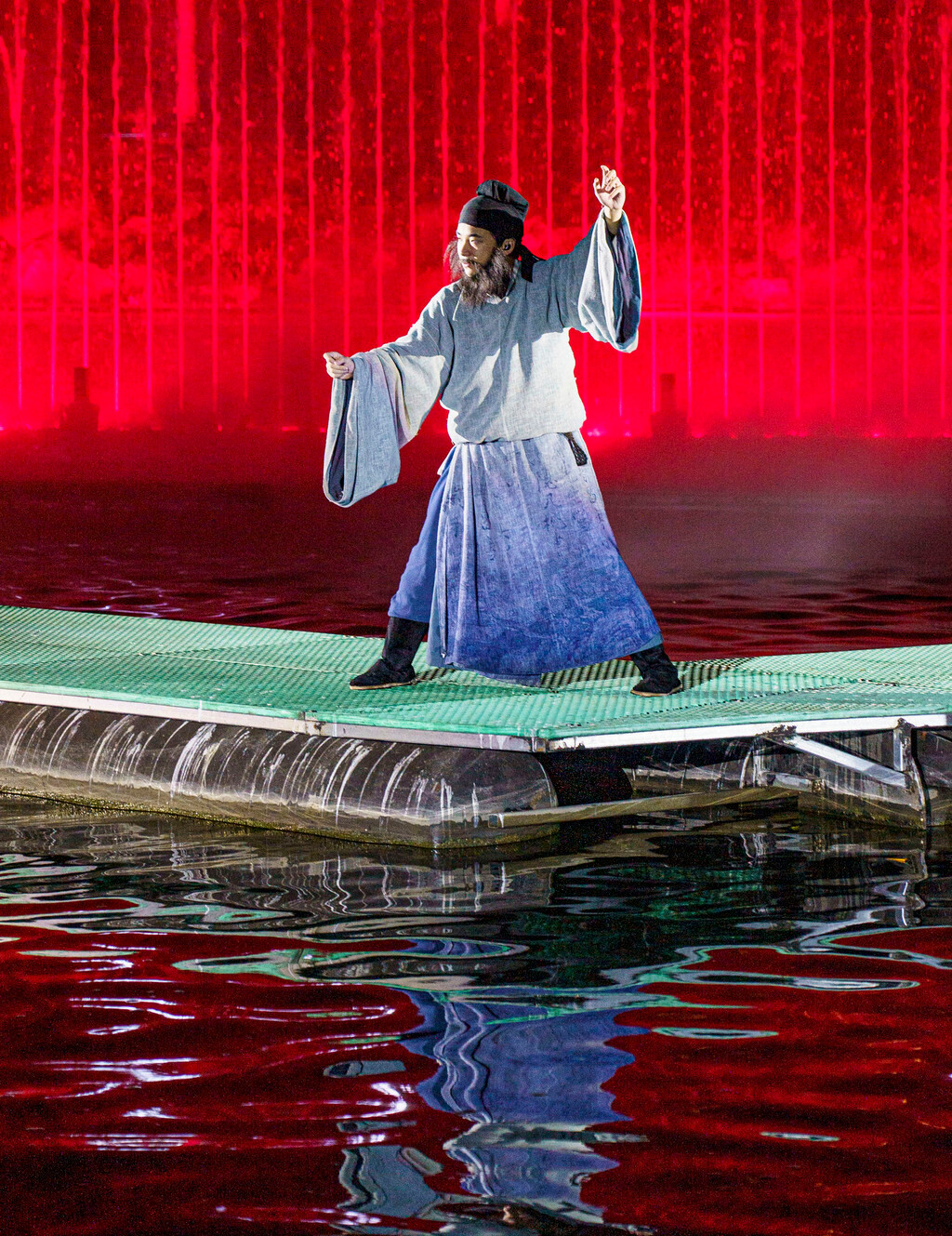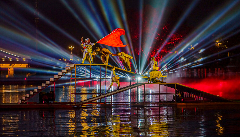 游船开动后会在桥边停上一会儿,方便大家欣赏激光水幕,然后再穿过桥洞,一路欣赏历史画卷、凤凰于飞、舞蹈表演、算圣刘洪、书圣王羲之、颜真卿、智圣诸葛亮、沂蒙红色精神,涉及人物的表演都是真人实景演出,还有光影、水幕、火焰等现场效果配合,非常震撼。