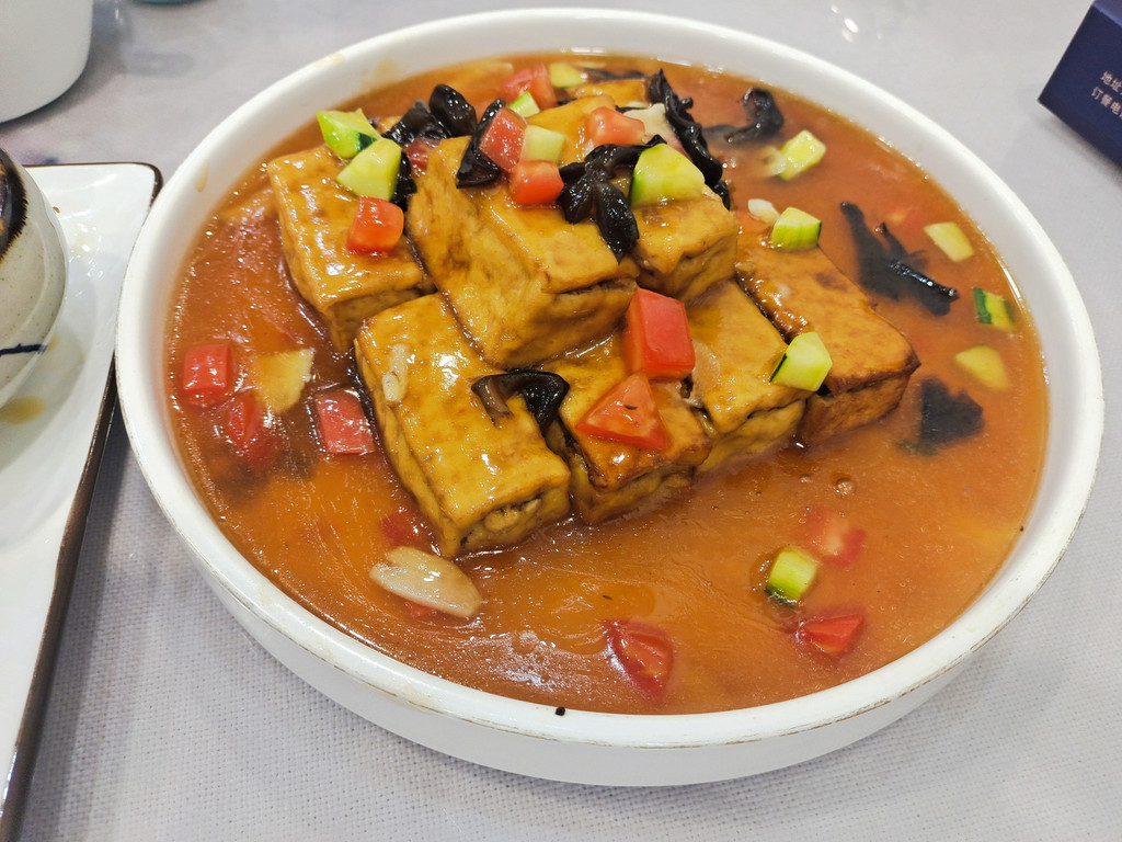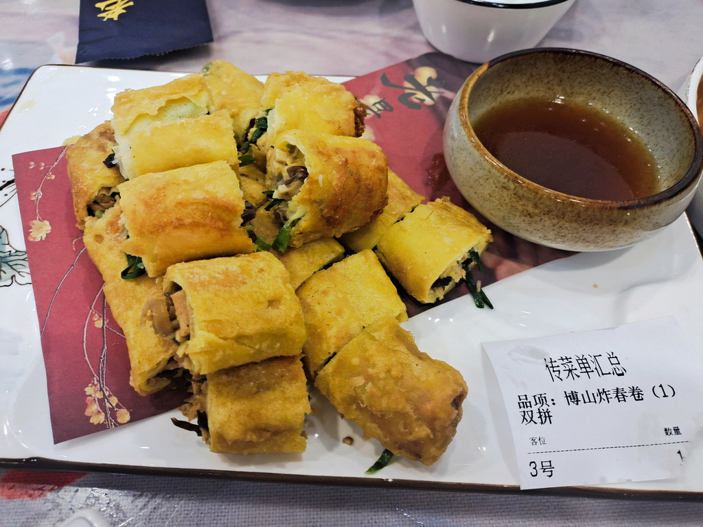 大约下午4点开车去博山城区。到博山入住后,准备晚上去吃博山特色菜。酒店服务员推荐了一家叫老昃(ze)私房菜,和我们说不是太远,步行导航去就行。博山四面环山,几乎没有直路,孝妇河穿城而过,我们住的酒店就在河边。路不熟只能按导航走,感觉导航也出问题了,绕了一大圈才找到 。到饭店已经是晚上8点了,还有不少吃饭的,大概都是来品尝博山菜的吧。我们点了博山最有名的豆腐箱、博山炸肉、炸春卷三个菜,因为量大,其它博山特色菜就没再点。味道不错,价格实惠。