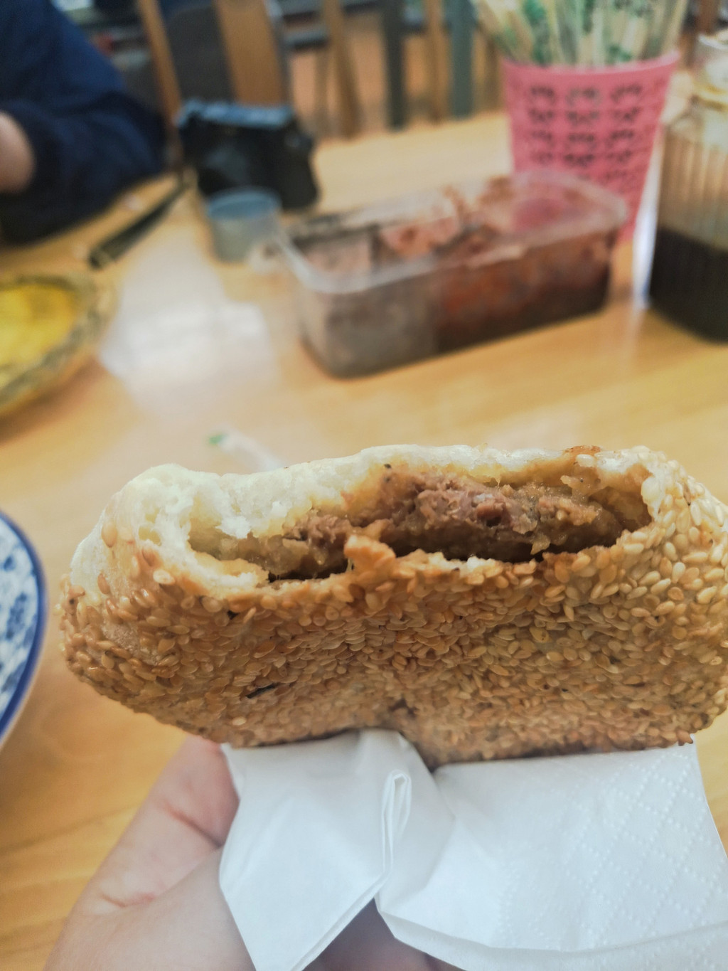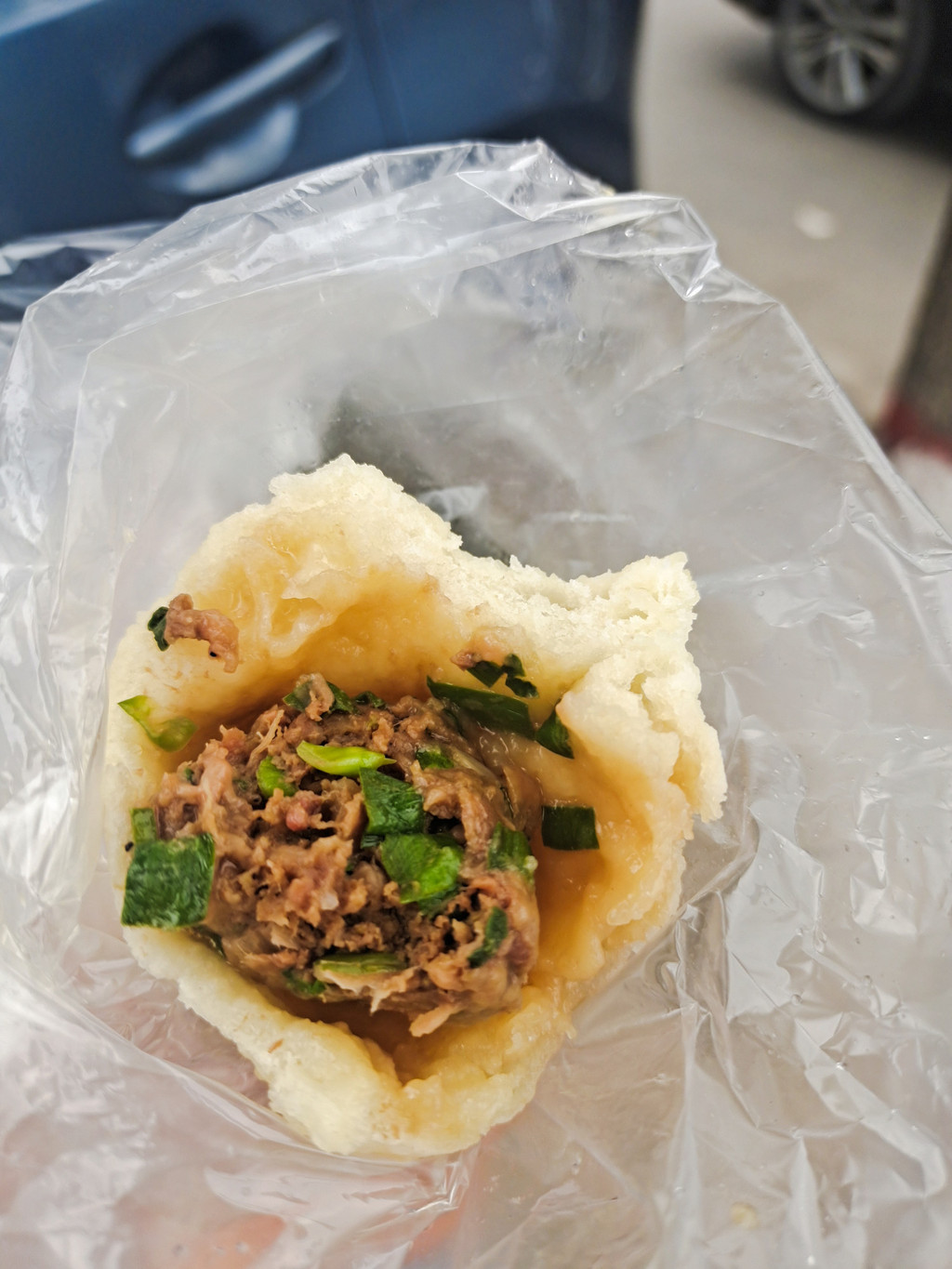 早上先出去看看附近有什么早餐,主要是想了解一下。在老昃包子铺买了2个牛肉灌汤包,(2元/个),在另一家买了一个焦庄精肉烧饼(3元/个),烧饼类似于潍坊的肉烧饼,都是尝尝而已。