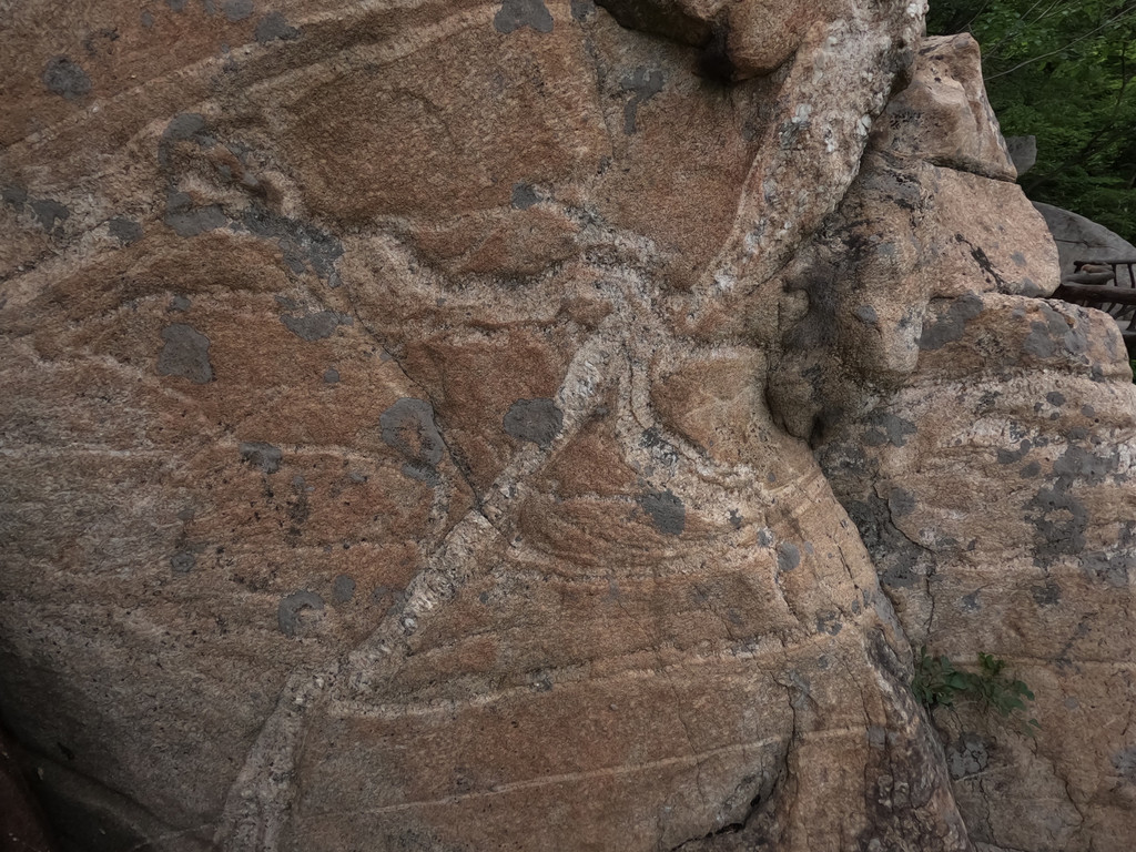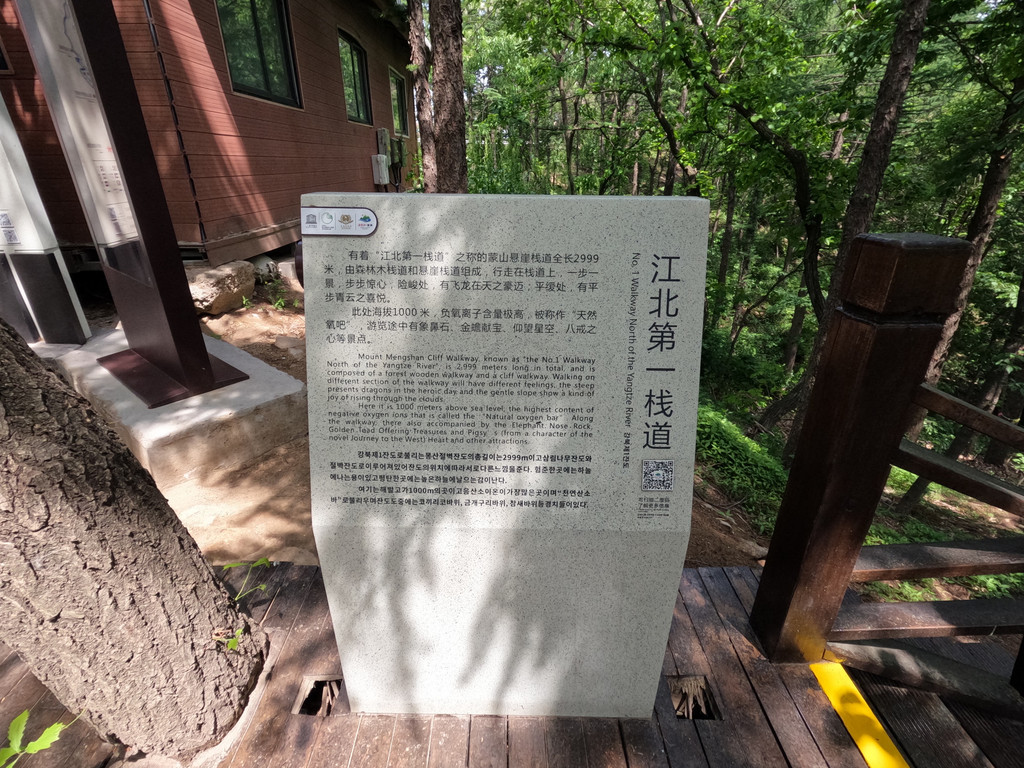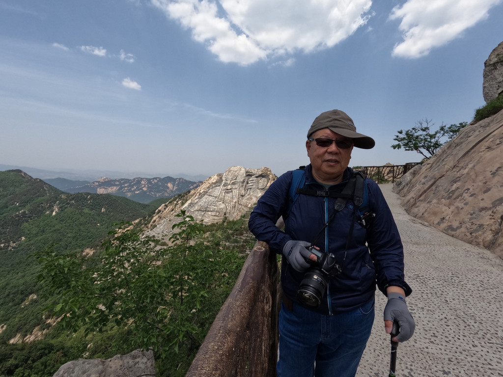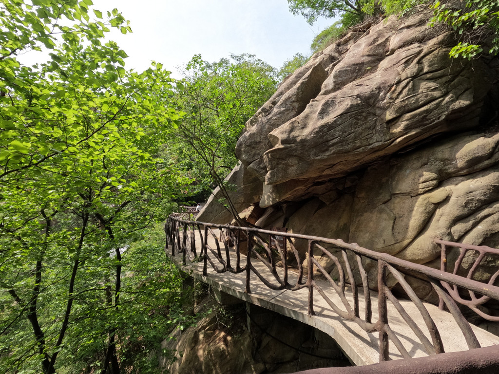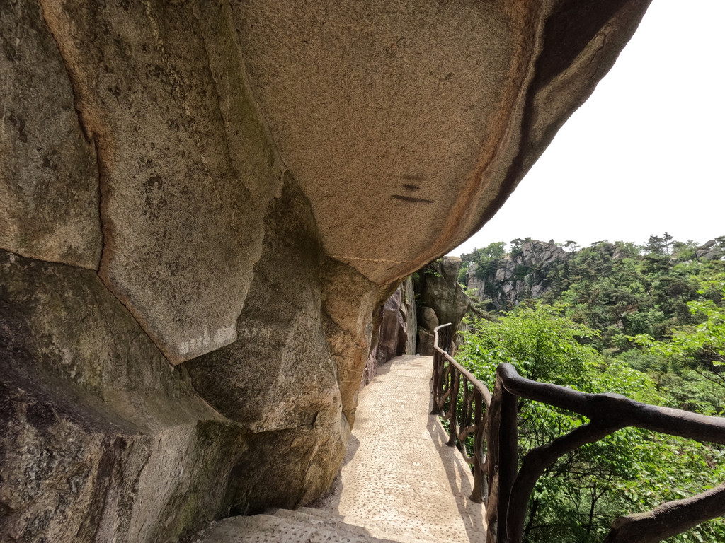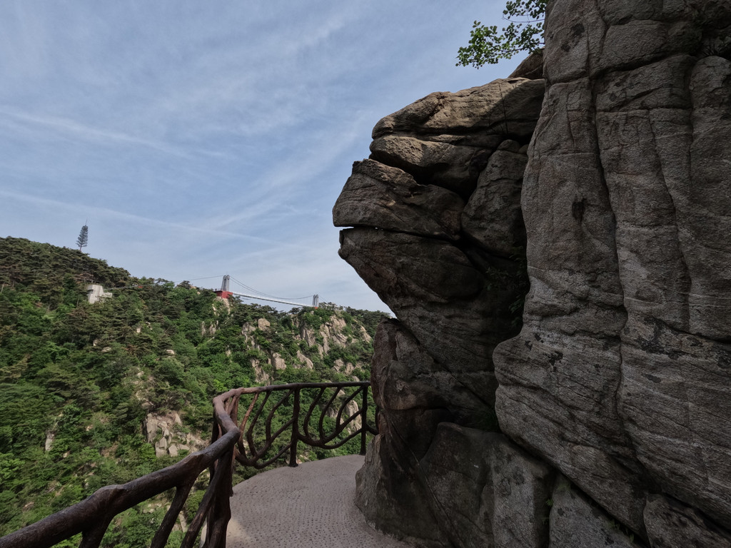 看完蒙山仙翁,本想沿路走出去,不知什么原因,路封死了,只能原路返回。爬山太累,坐索道返回。回到摆渡车乘车站点,没坐,走江北第一栈道往山下走。沿途景色不错,有许多象形石。不过走的人很少,遇到几位上山的游客,下山只有我们两个人。