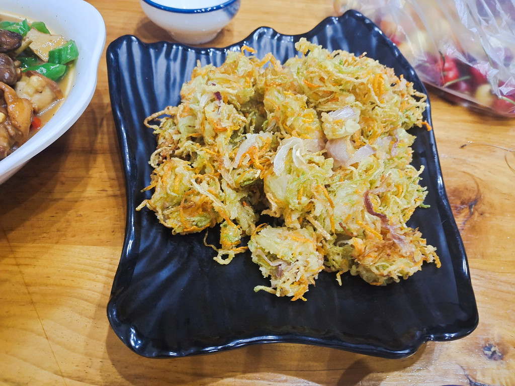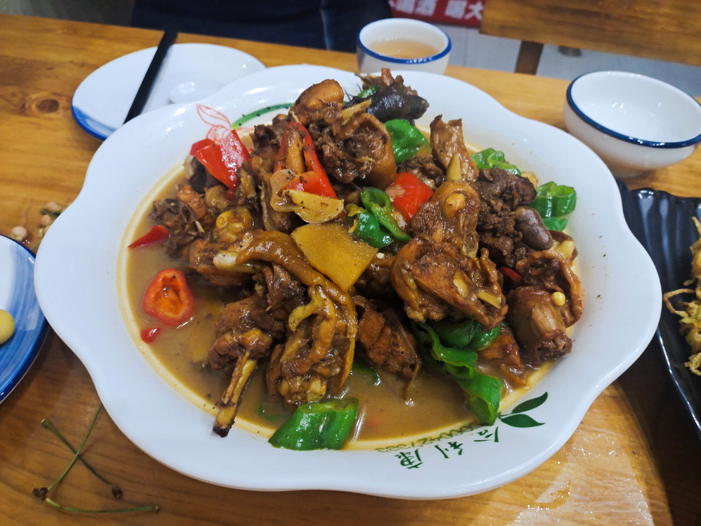 在蒙阴入住酒店后,去附近的饭店吃饭。光棍鸡是蒙阴当地特色菜, 创始人付泽明在蒙阴县城西岭开设炒鸡店,以烹制蒙山大公鸡为主,因炒鸡店工作人员全部是男士,取材又全是大公鸡,便将此菜戏称“光棍鸡”。我们点了一份光棍鸡和一份炸蔬菜丸,量挺大。