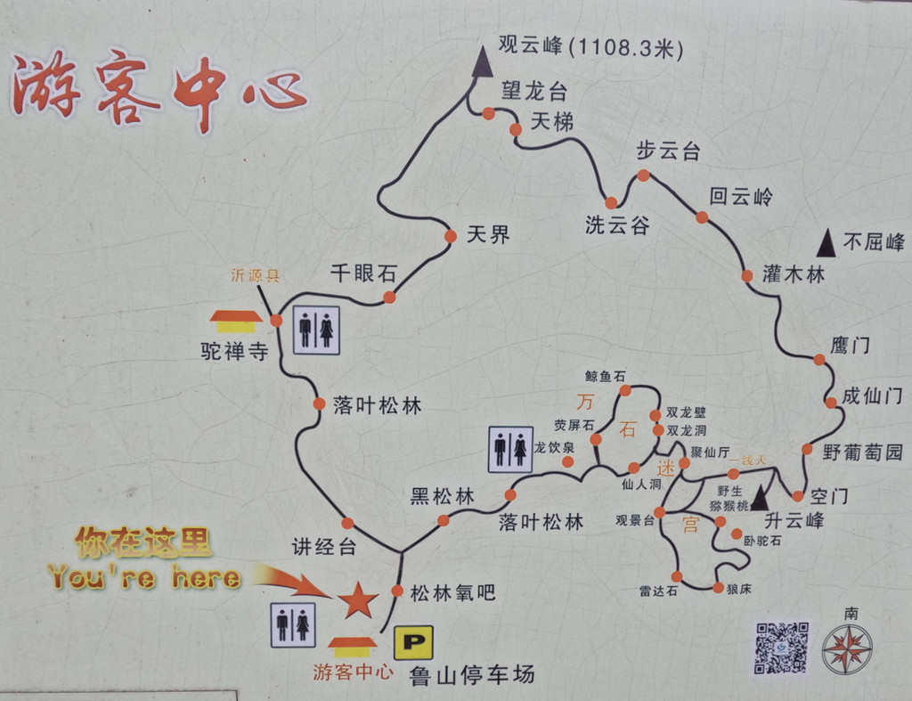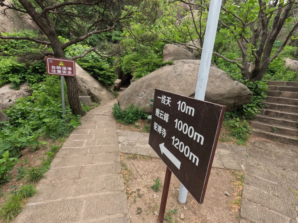 鲁山海拔1108.3米,是山东六座千米以上的山峰之一。 基本保持原生状态,沿途基本没有服务设施,虽然导游图上标了很多景点,但只有万石迷宫和一线天(一线天也没有想象中的窄)有指示牌,其它景点没有指示牌也就不知道了。因为车开到了半山腰,爬起来并不是很累,很快就到了观云峰顶。