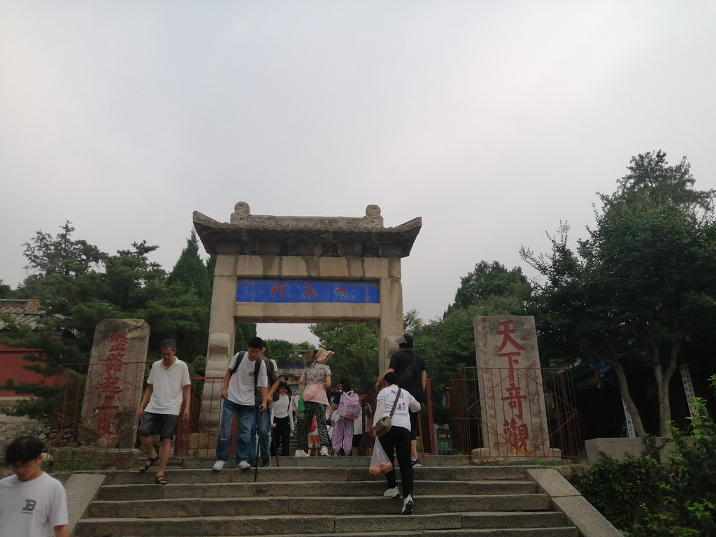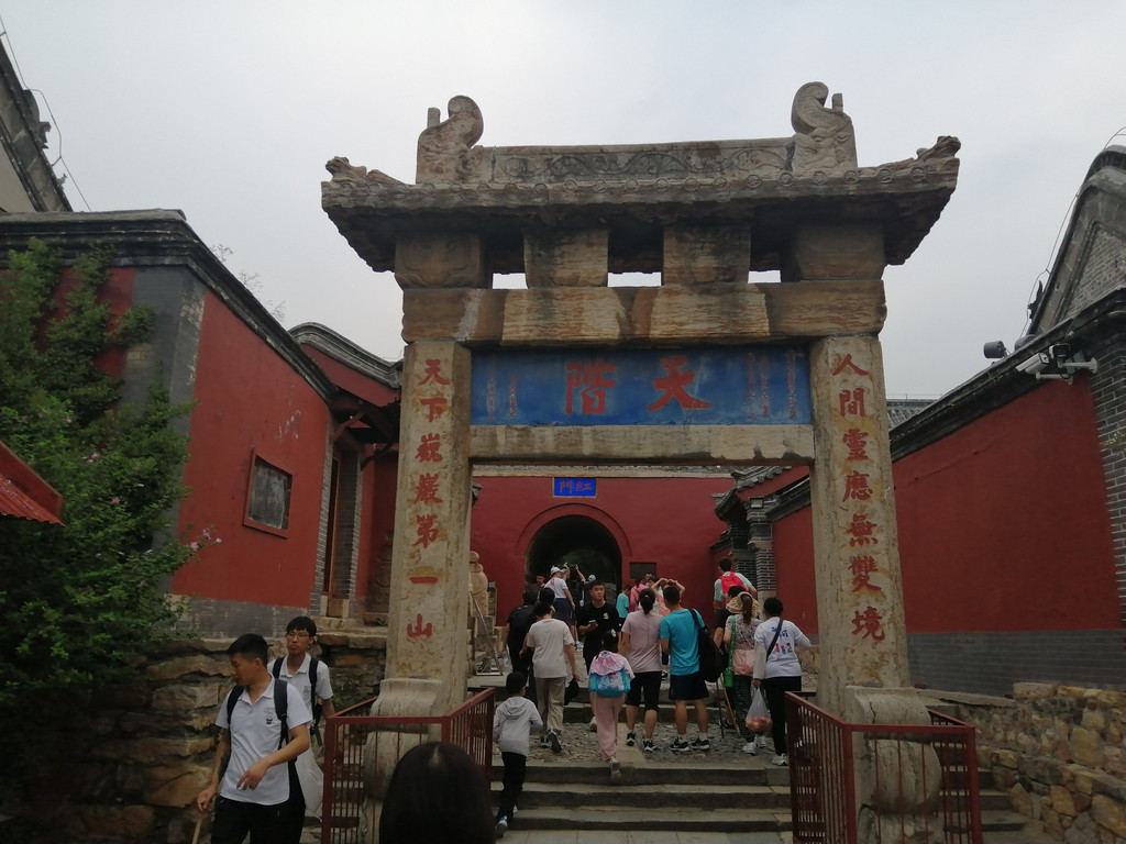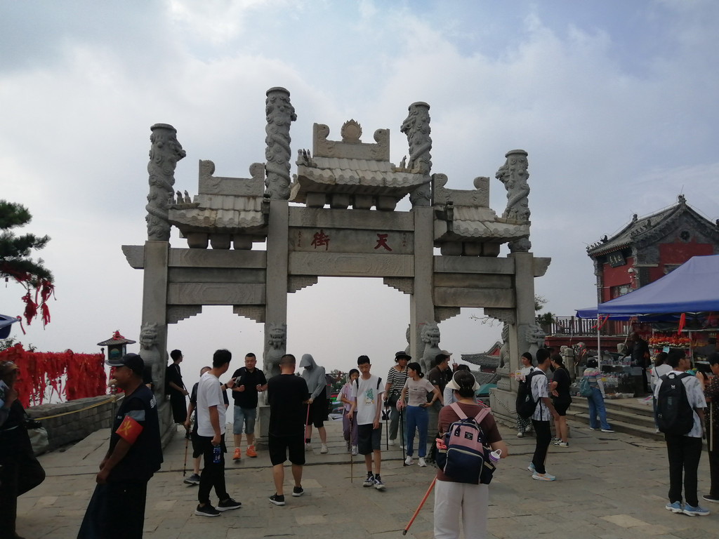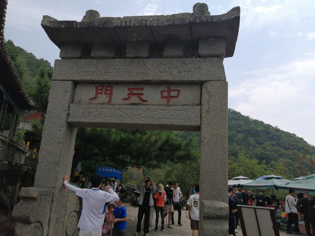 中天门石牌坊旁边是财神殿。泰山上财神殿挺多的,后来到了山顶也看到好几处财神殿。此时是11:15 由于太热,走走歇歇从红门到中天门爬了3个多小时。