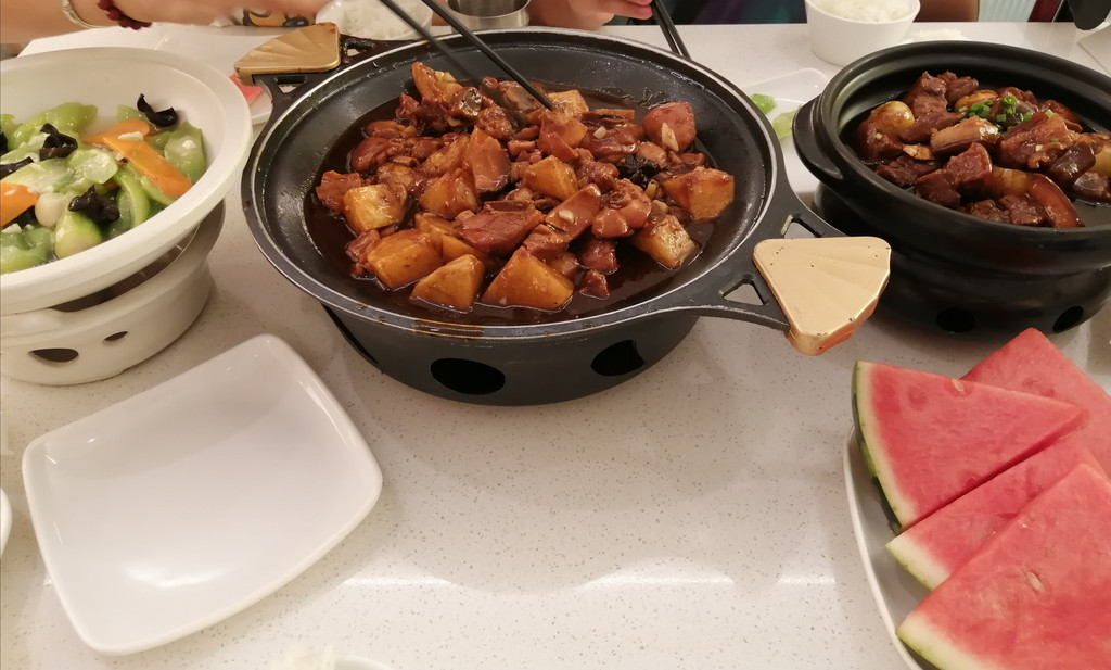 万达广场吃晚饭。山东人就是实在,菜的量比南方大多了,味道也不错。五块钱一人座位费:饮料,冰激凌,水果无限敞开吃。三荤菜,一蔬菜,外加三个人的座位费189 同样的晚饭,在无锡万达广场这一顿晚饭至少要250往上。泰安这里的消费水平还是和二十多年前来时一样,比起江苏苏南地区低多了。米饭不错!是正宗五常大米。大老爷一口气吃了三碗。