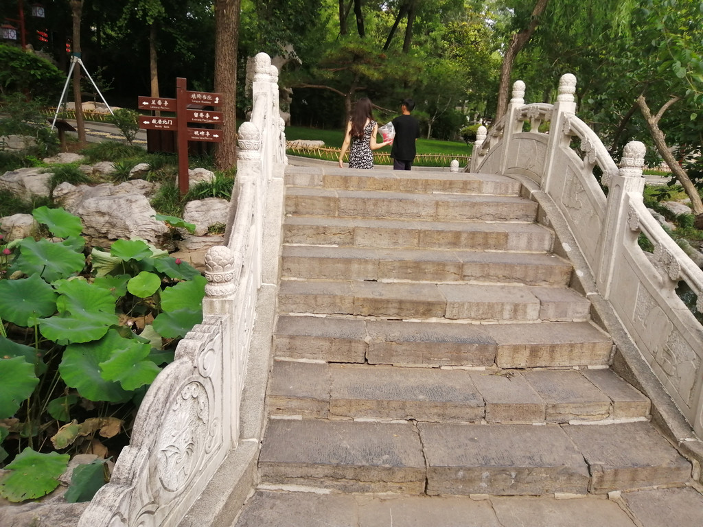 老婆儿子在喂鱼。我登上了北门城楼远望泰山。顺着眼前这条中轴线一直往前就是红门。登楼时爬台阶腿脚疼的。下去也是如此。
