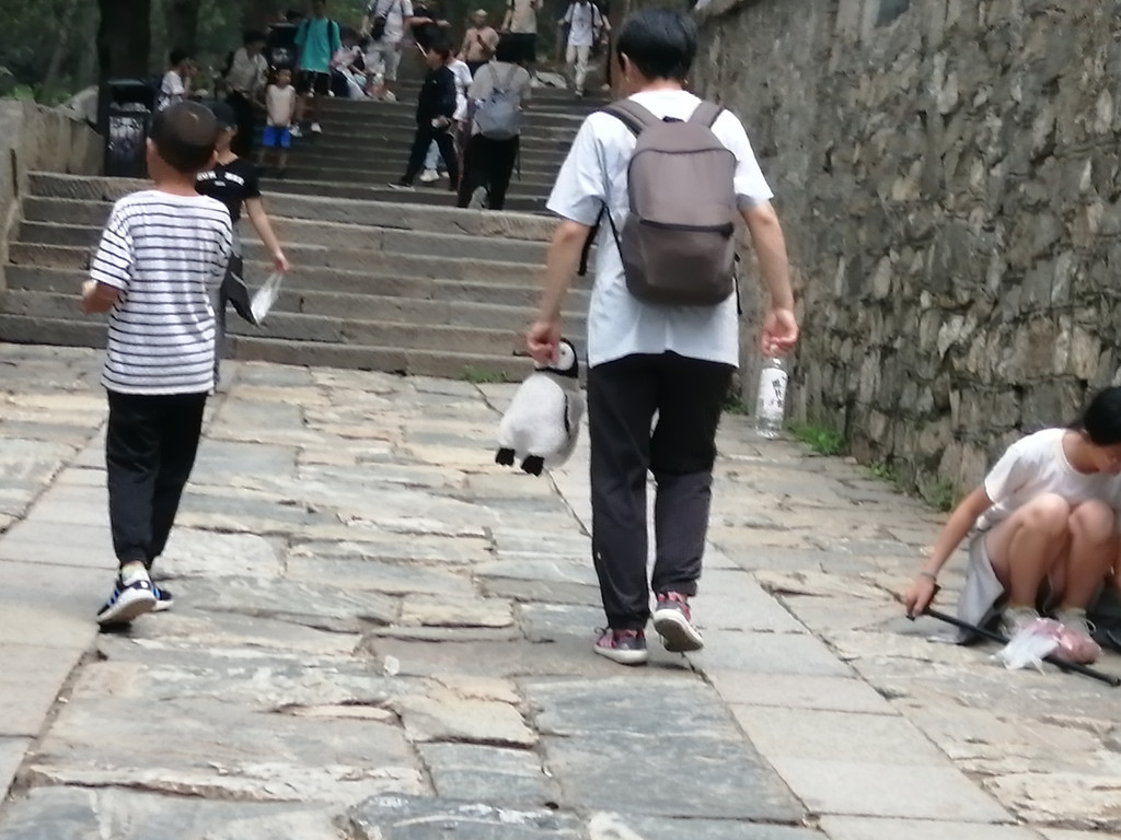 这个小朋友出门非要带个毛绒企鹅。他妈妈说,企鹅肚子里还装着一个小企鹅。爬了一段他不肯拿了,只好妈妈给拿着。