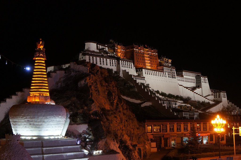 大昭寺旁边就是八角街。拉萨现在在进行城市改造,路面到处都在挖,也象广州一样开始堵车,八角街也搭起了棚架。我随着八角街转经的藏民在拨转经筒时,大概因为一眼就能看出来是游客,一个藏族小伙儿忽然从后面绕到我面前问我:“哪里来的。”我下意识地回答:“广东的。”他笑嘻嘻地说:“哦,广东美女。”哟,被藏族兄弟调戏了,还以为藏族同胞都很实诚了,肯定是被汉化了>_<。。。。。我和rabbit随便转了一圈买了些藏香就去看布宫的夜景了。进入布宫广场要安检,我们进去后,听到安检的兵哥哥不知在对谁吆喝:“我不会讲英语,只会讲普通话呀,打火机、火柴请拿出来不要带进去呀..... "布宫的夜景很美,但是远不如林芝的桃花吸引我,因为那毕竟是可遇不可求的,即使明年桃花依旧笑春风,也不是一样的桃花了。