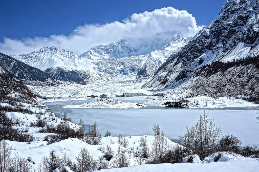 中午在然乌湖边吃的午饭,然乌湖的下半段还是大面积冰封。我本想在然乌过一夜,不过欧阳和小巫都说然乌的住宿条件一般就作罢了。下午去了米堆冰川,上冰川的路不好走,我吸取了各位驴友的经验,没怎么想就决定花100元骑马上去。两个藏族小伙儿给我们俩牵马,邢师傅再三叮嘱:千万别摔着啊。我已经有了在山上和草原骑马的经验,所以骑得很放松。rabbit却紧张得不得了,驮她的那匹马都被她吓坏了。一踏上冰川观景台大家都不禁会“哇”地一声。虽然眼前的冰川在阳光的照射下耀得人眼睛发疼,但我还是眯着眼睛不停按下快门。