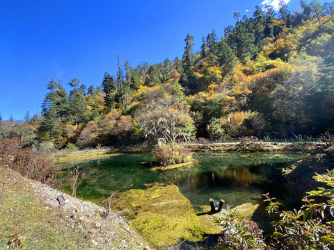 对岸山坡上林木层层叠叠一派生机盎然,山脚下满目翠绿的丛林渐变为黄色一片,分辨不出那些黄色枝叶是明黄亦或是橘黄?疑惑间,再看眼前这片斑斑点点的橙色林叶中分明还裹着星星醉红!纷总总其离合兮,斑陆离其上下,一时姹紫嫣红,秋色灿烂。
