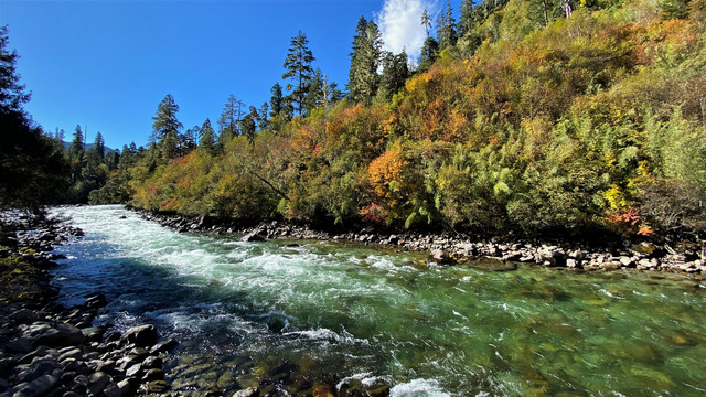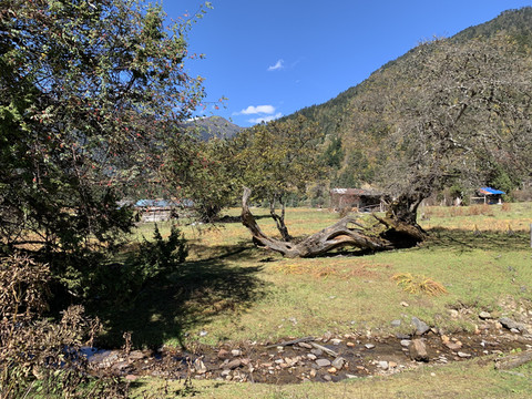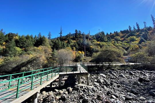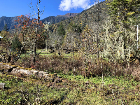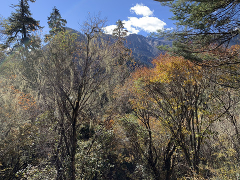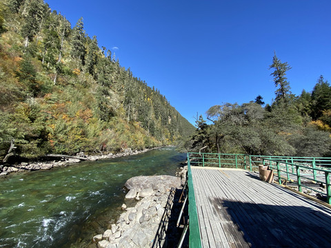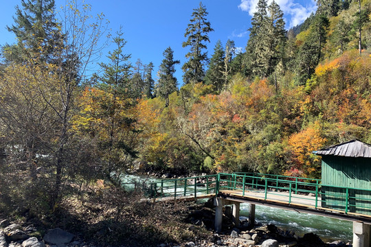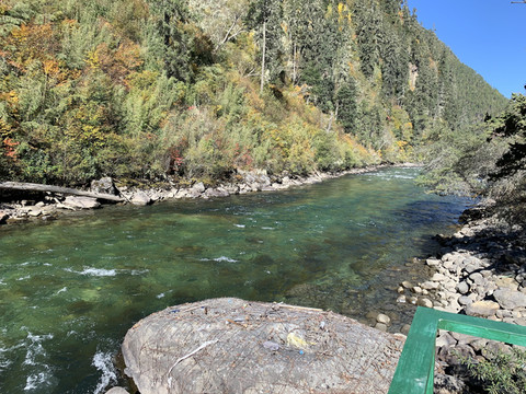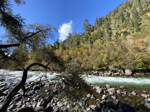 湍急的南伊曲水在谷间轰然鸣响,高山蓝天,林木繁茂,浅绿的松萝,金黄的枫叶,这里到处都在散发出秋天的宁谧与瑰丽。