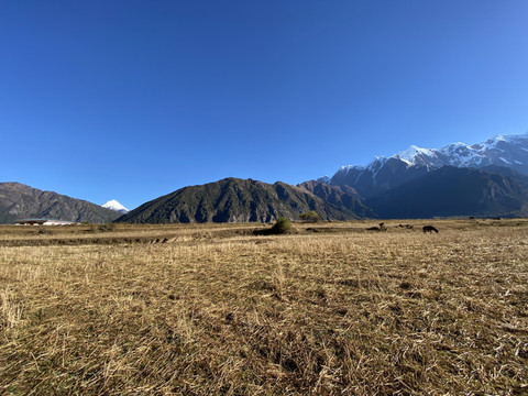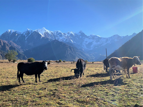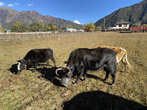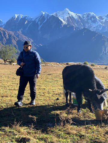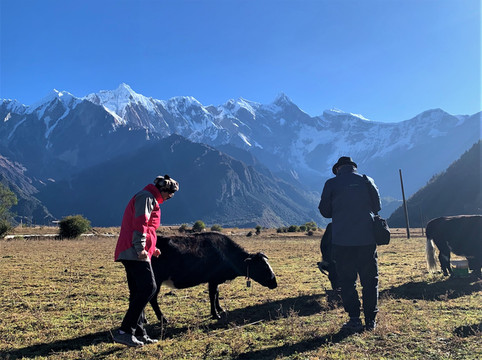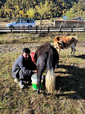 村头地间一个藏族男子在挤牛奶,我们过去想与他的牛儿合影。男子很和蔼友善,平静的与我们聊起他们的生活。我默默地想,这种恬静、与世无争的景象应该就是人间仙境吧!