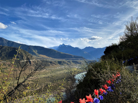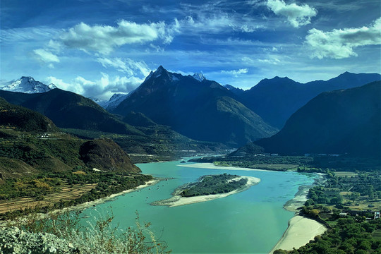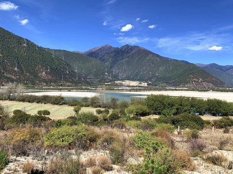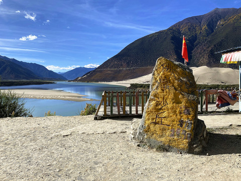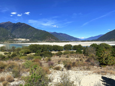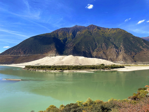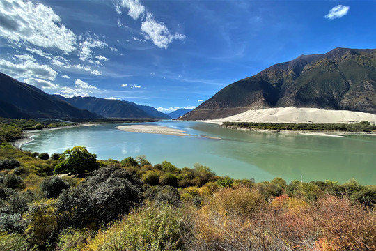 站在观景台放眼西望,群山环抱之中,碧水白沙相交映,沙洲如鱼逆行,江水似游龙戏走,没有浪花,没有涛声,唯有色彩斑斓的秋色伴着雅鲁藏布江在宽谷中流淌。