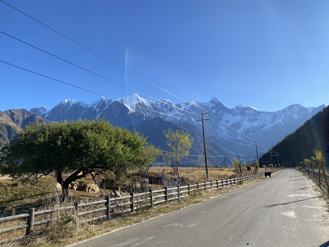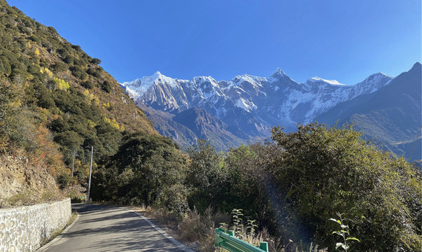 峡谷内景色风光差异巨大,河谷平原上生长着大片常绿阔叶林,奇峰高处则岩石裸露一片白雪皑皑。行进在峡谷公路上,好似游走在一幅精美的水彩画间。