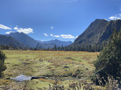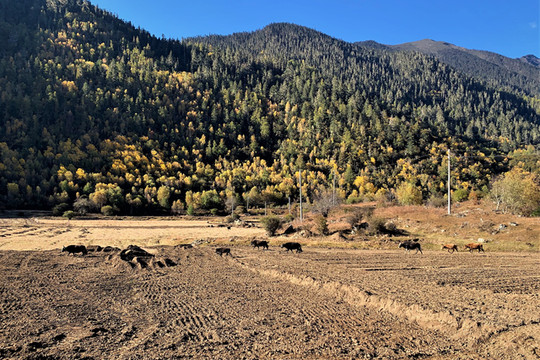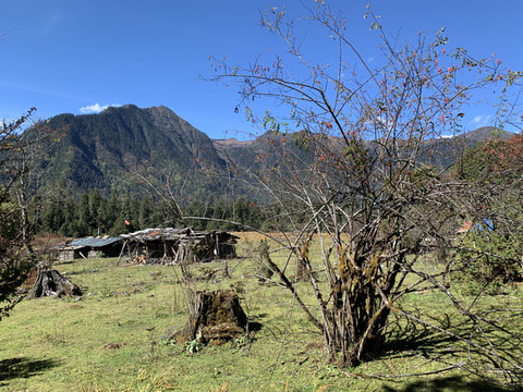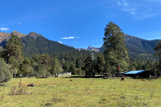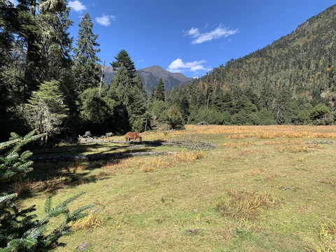 走出森林,豁然开朗,眼前是一片开阔的草甸,丛生禾草已经开始换上金黄色的秋装,根茎性禾草仍在葱绿之间。牧场四周青山环抱,牛马悠闲,几间牧人小屋点缀其上,其景色风光令人留恋,实乃马穿野径菊初黄,村桥原树似吾乡。