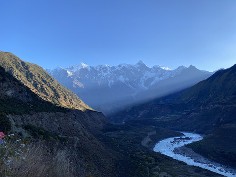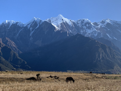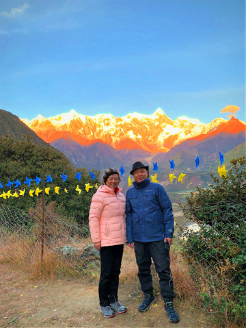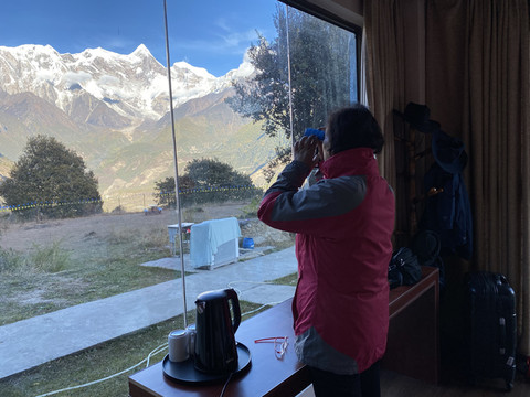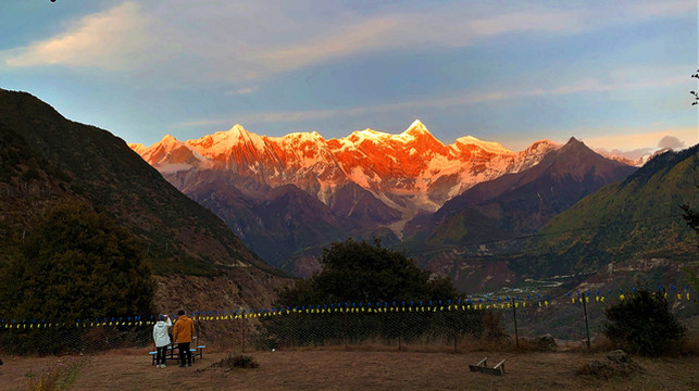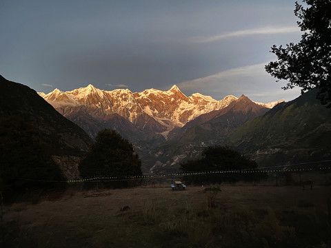 整个日照金山高潮时间不到十分钟,峡谷内便渐渐趋向暗淡,南迦巴瓦及其诸卫峰山顶开始变为暗红色,院内的气温也骤然降低了许多。