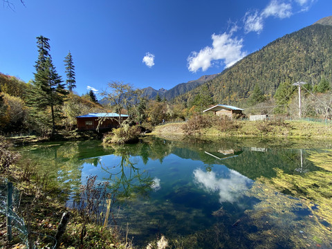 栈道的尽头是一个池塘,池底水草隐现,水面飘浮着金黄的落叶,池塘没见到进水口,也没看到出水口,绿色的水面上唯留下谜一样的片片白云。