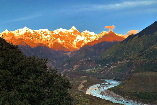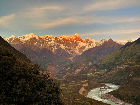 下午18点45分,太阳西斜,四周高山巨大的阴影覆盖了峡谷,开始慢慢爬上南迦巴瓦峰山脚,并很快的吞噬着山体。南迦巴瓦及其诸卫峰山顶上的冰雪开始变成极亮的火焰內焰色,燃烧的山体变的通红,半山腰的云朵瞬间变成红云,就连大峡谷内雅鲁藏布江的江水亦被映红,这就是人们常说的日照金山啊!