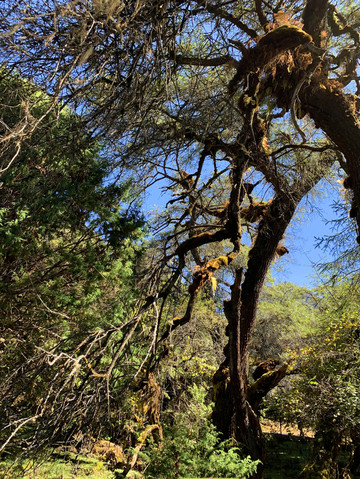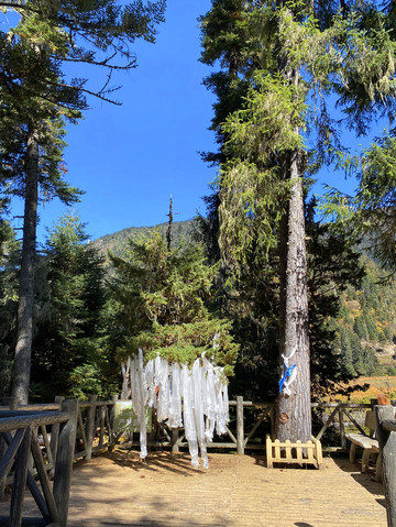 栈道的尽头是栅栏围起一方空地,栅栏外有一棵并不高大的树,外形酷似塔松,但树叶却决然不同,树冠上挂满了哈达,原来这就是珞巴人供奉的阴阳神树,这方栅栏围出的空地是祭祀专用的场所。