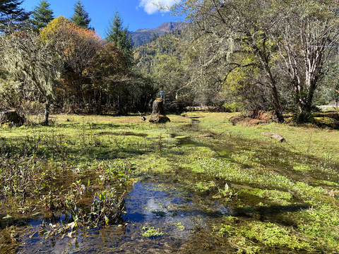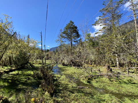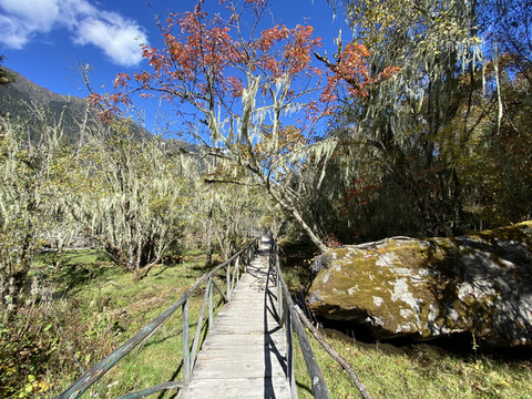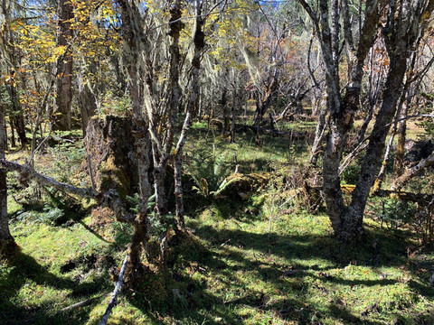 离开南伊河观景台,继续上行十几分钟,来到一片沼泽地前。一条带有护栏的木板栈道引着我们进入这片神秘世界。栈道两旁松萝密布,草绿色的长松萝垂挂在树叉枝丫间,犹如舞台上的帷幔;脚下是生长茂盛的地衣水草,一股泊泊清流漫过草地消失在不远处的林丛间;随处可见长满青苔的粗大树根桩与倒卧在荒草地中巨大的圆木,它们似在静静地诉说着一段古老与沧桑……。